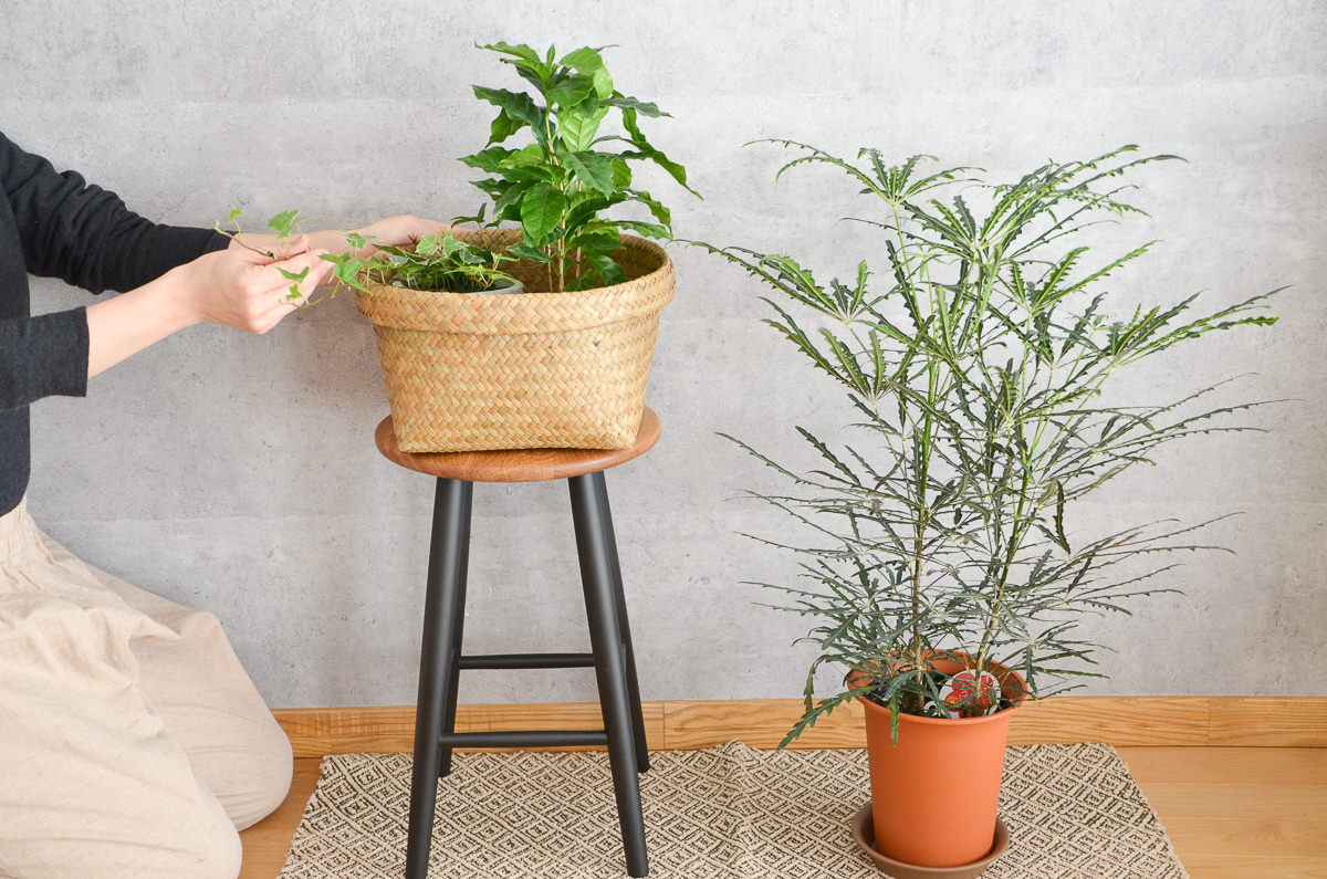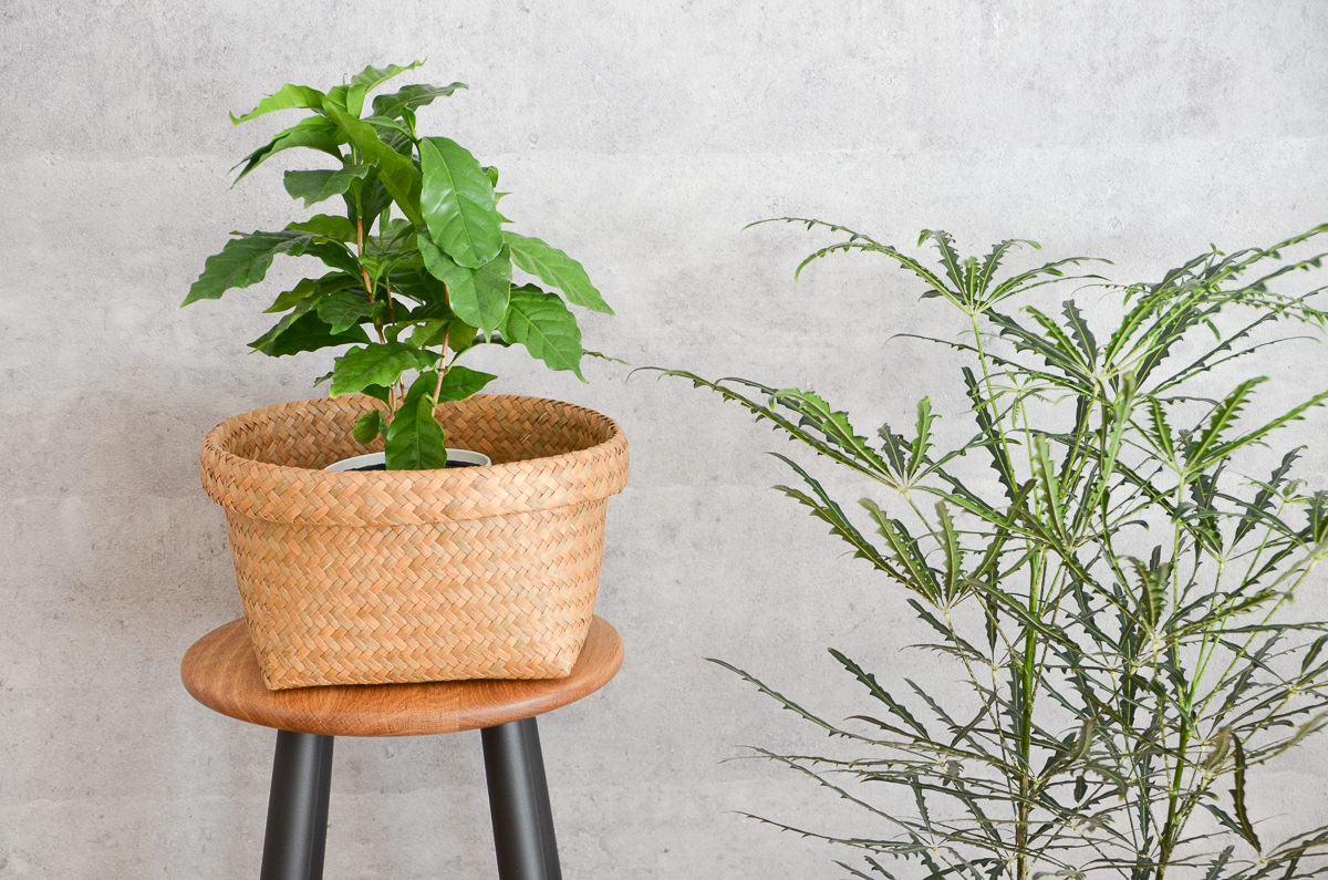 鉢カバーにしたり、おもちゃを入れたり。カチューのかご表面に塗られた糊は、形崩れを防ぎ、
