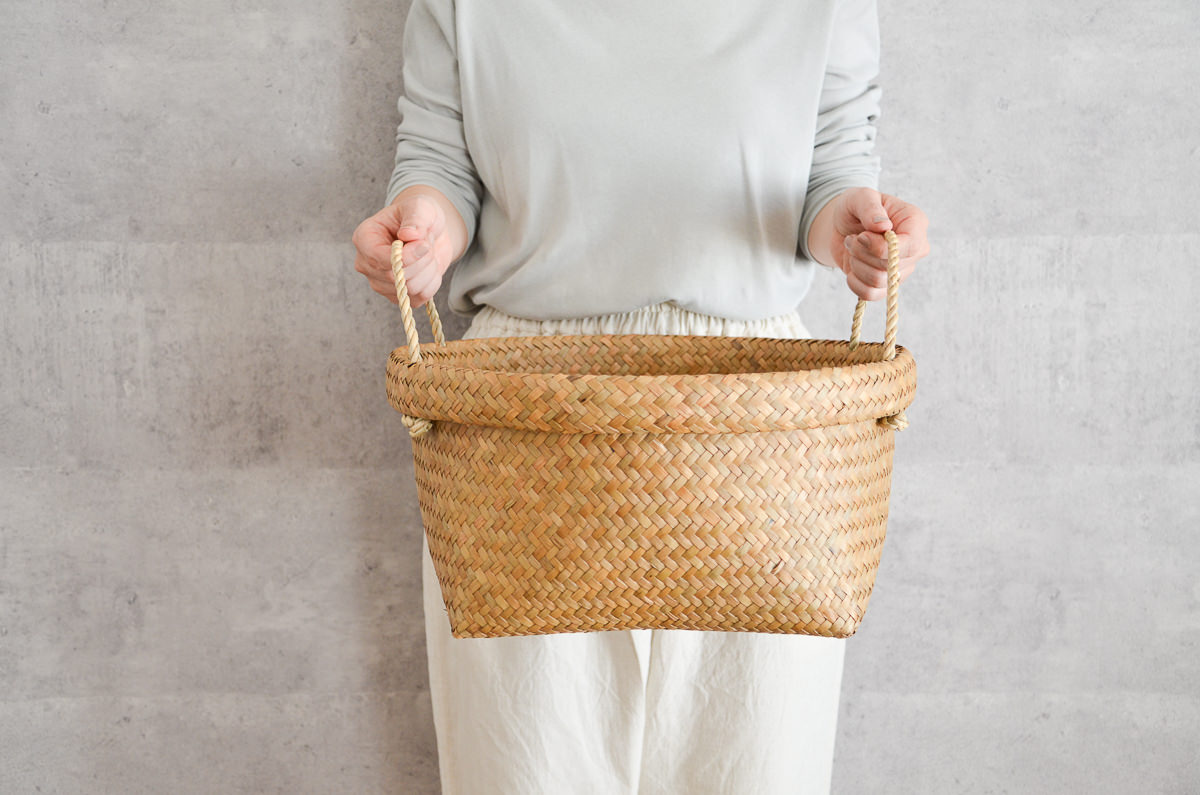 こちらのページでは、「カチュー」製の取っ手がついた丸型かご、