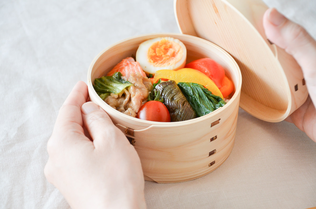 このような白木の弁当箱は、食材の水分を適度に調節してくれるのが
