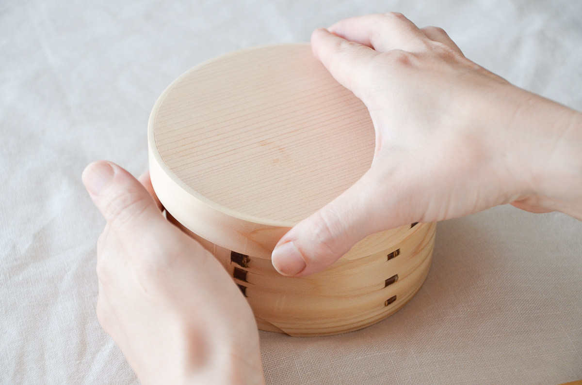 仕上げとして桜の皮で留めている、丸型の弁当箱をご紹介します。