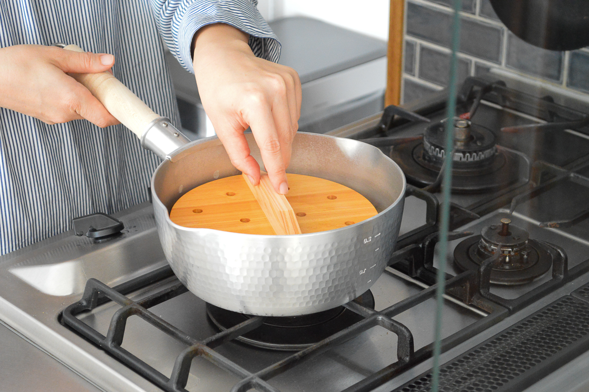 穴あき落し蓋を使って調理している様子、ご覧ください。