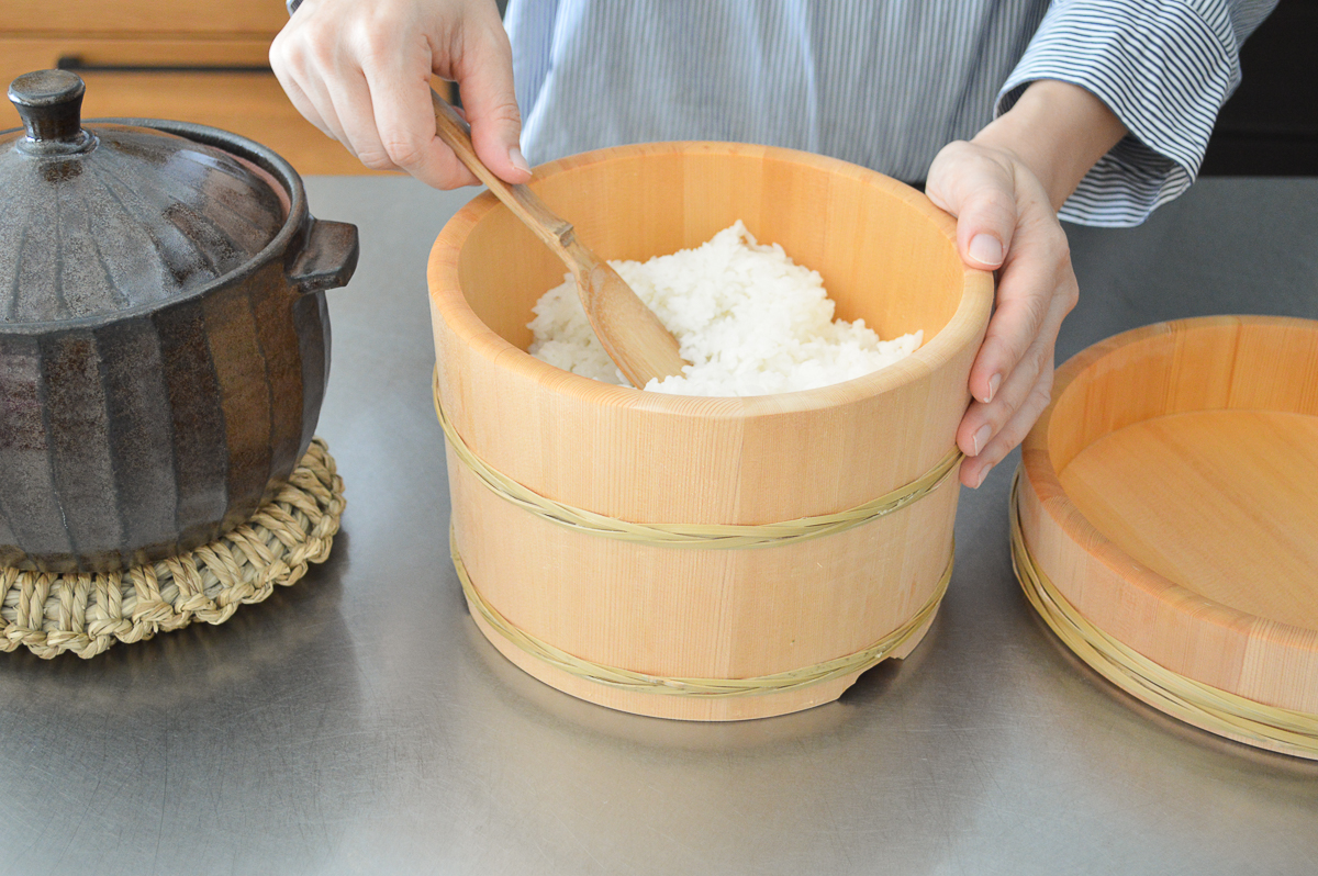 ご使用になる前に、濡れた布巾で内側を軽く拭いてください。蛇口からの水で直接濡らすと、おひつが水分を含みすぎてご飯がびちゃっとなるのでおすすめしません。ぬらして固くしぼった布巾で拭くのがちょうど良いです。