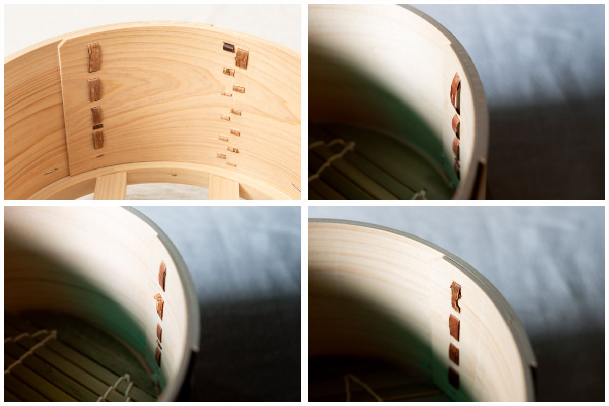 底面の縁はひのき板を重ねて、釘を打ち、厚く仕上げています。円付き鍋や蒸し板に安定してのせることができます。製作の過程で、せいろに多少の傷が付くことがありますが、不良品ではありません。予めご了承ください。