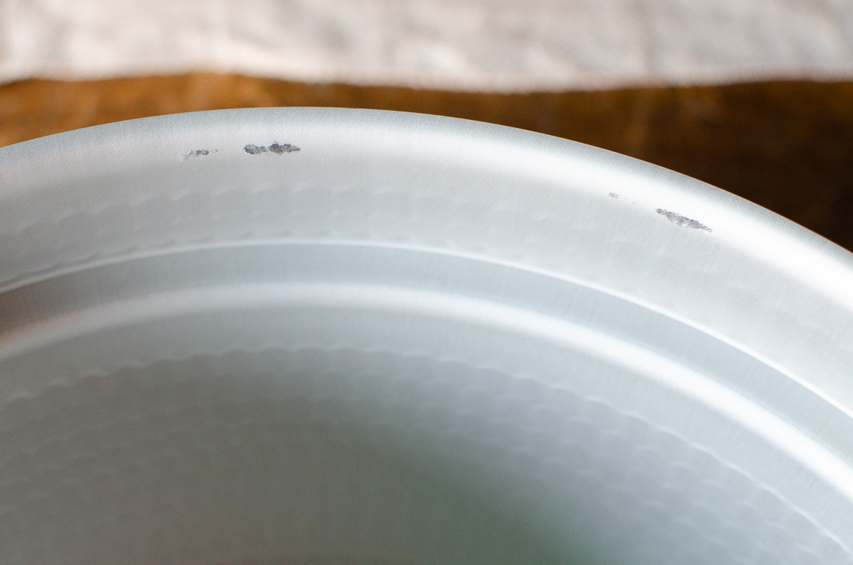 時折、鍋と鍋が擦れたような小さな痕がついている場合があります。使用される分には問題なく、不良品とはなりませんので、予めご了承ください。
