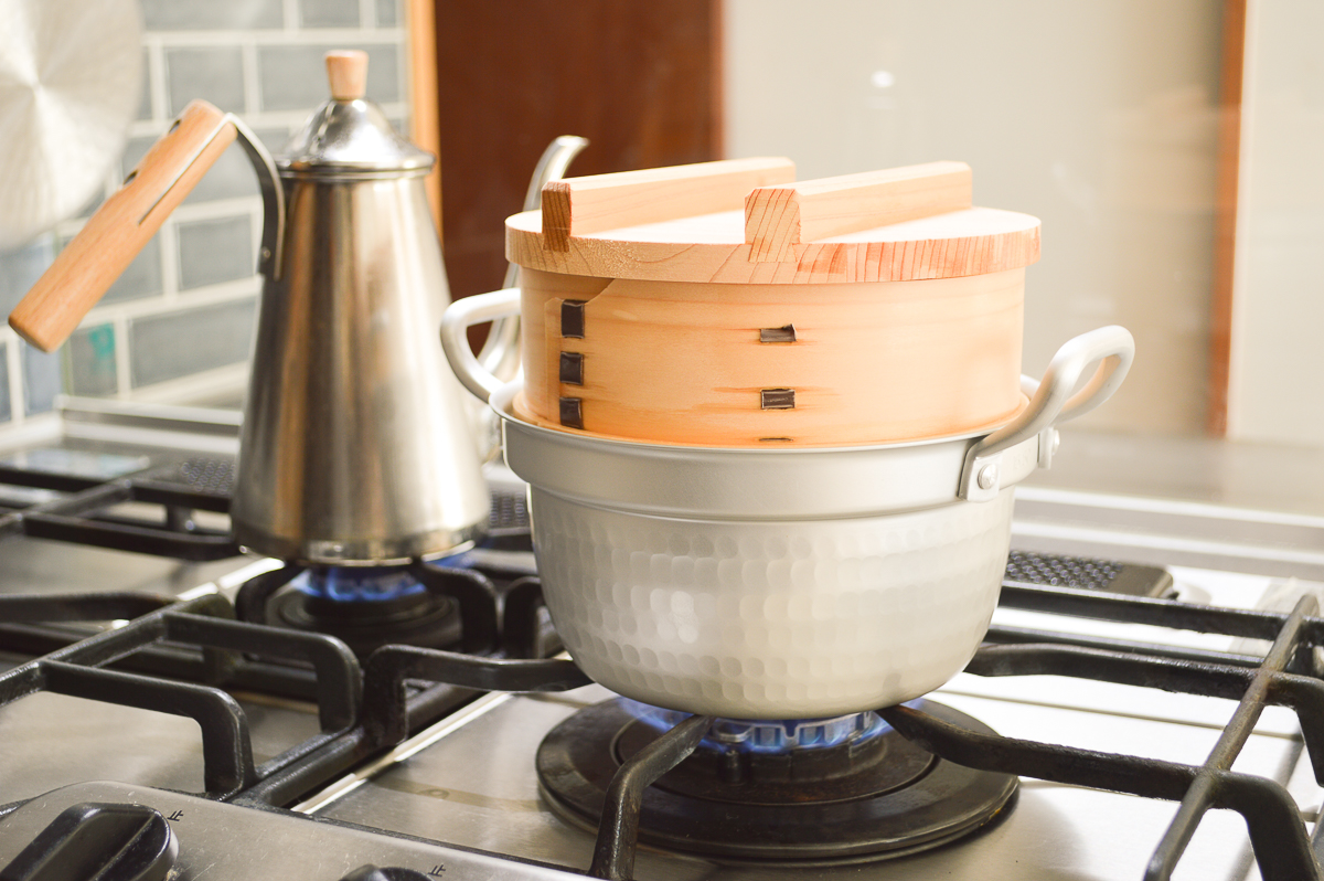 こちらは21.5cmの段付鍋に、21cmのミニ和せいろを載せて調理しているところです。その佇まいはきりりとして、なんとも味わいがあります。