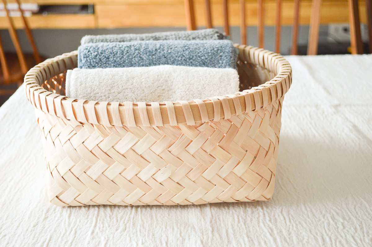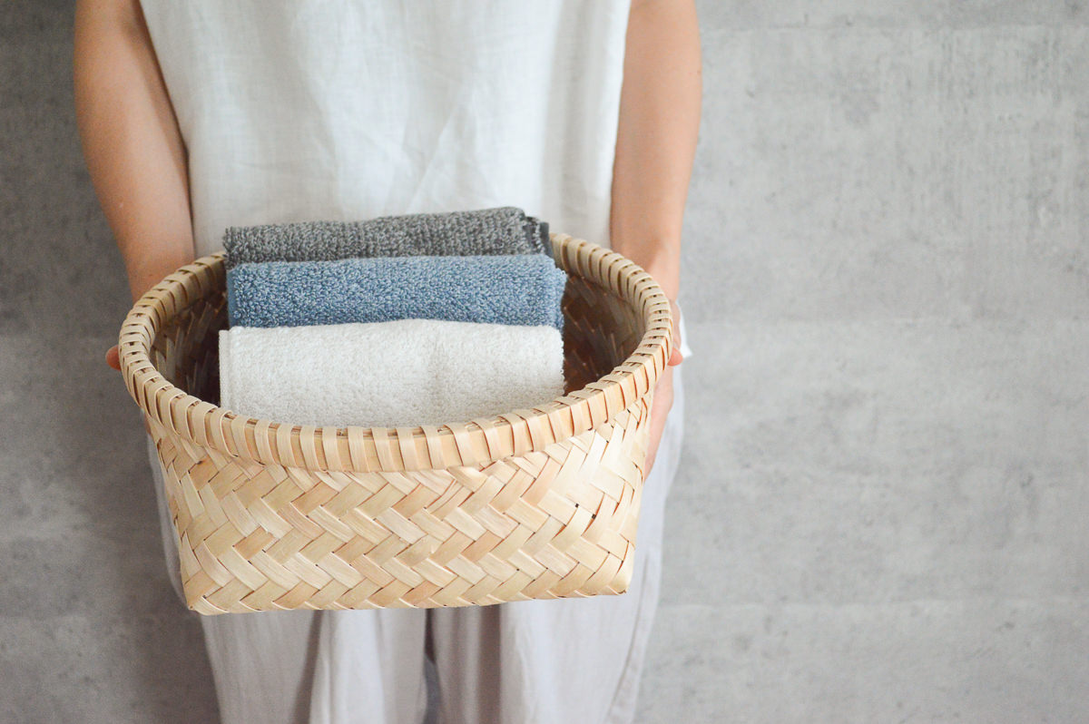 かごの内側も丁寧に処理され、なめらかな表面なので、タオル入れとしてもいいと思います。さらっとしたイタヤカエデのかごは、中に入れたものを傷つけず、