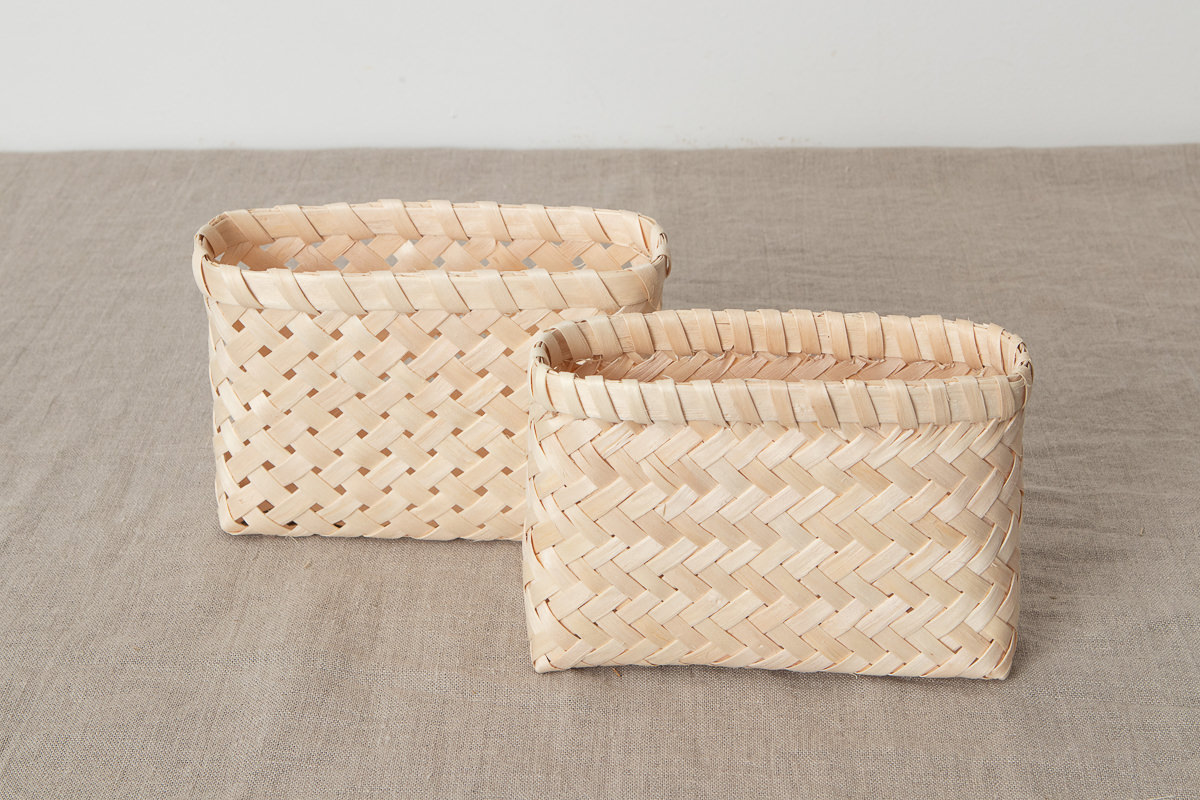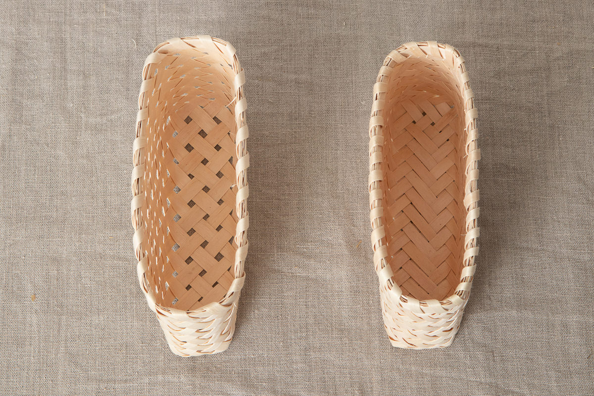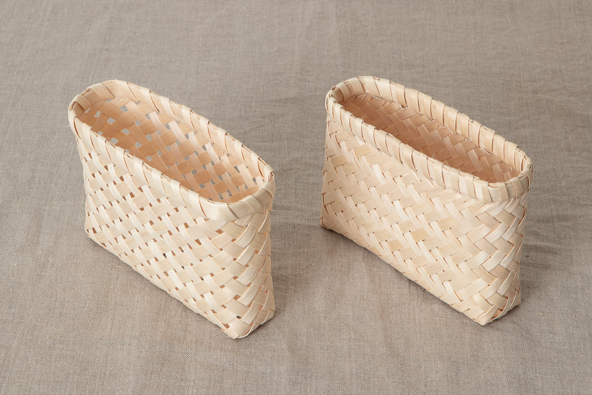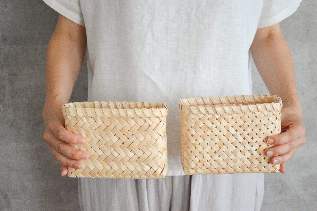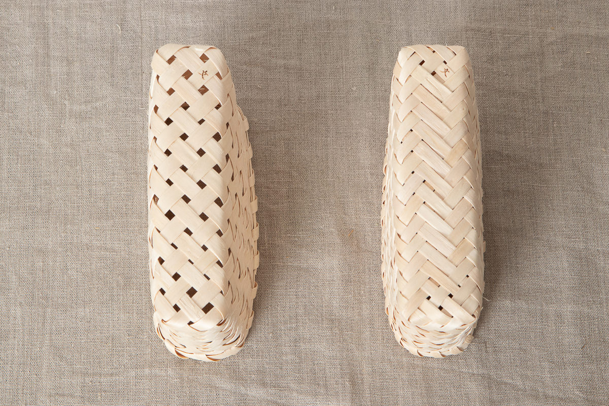 写真左は「あじろ編み」、写真右は「四つ目編み」という編み方で仕上げられています。