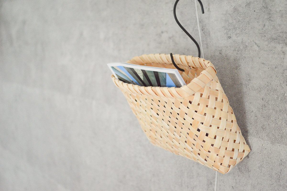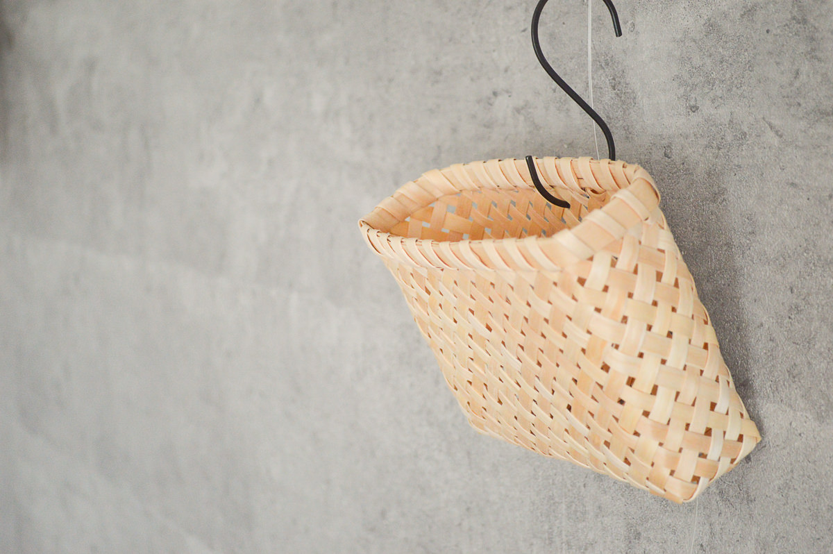 あじろ編みタイプは編み目が詰まっており、フックには引っかけにくいため、このように壁に立てかけておくのがよいかと思います。