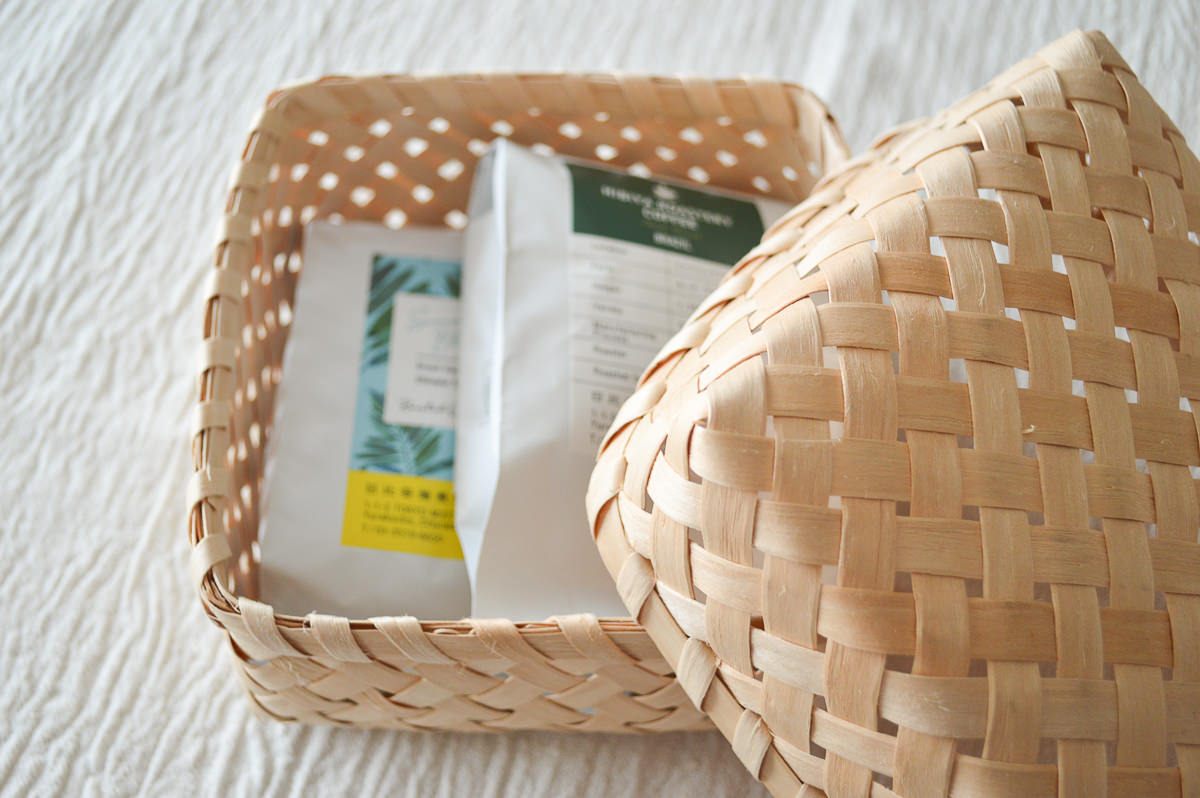 自然の素材で作られた細工では、ありそうでなかなかない、蓋付きの四角いかご。