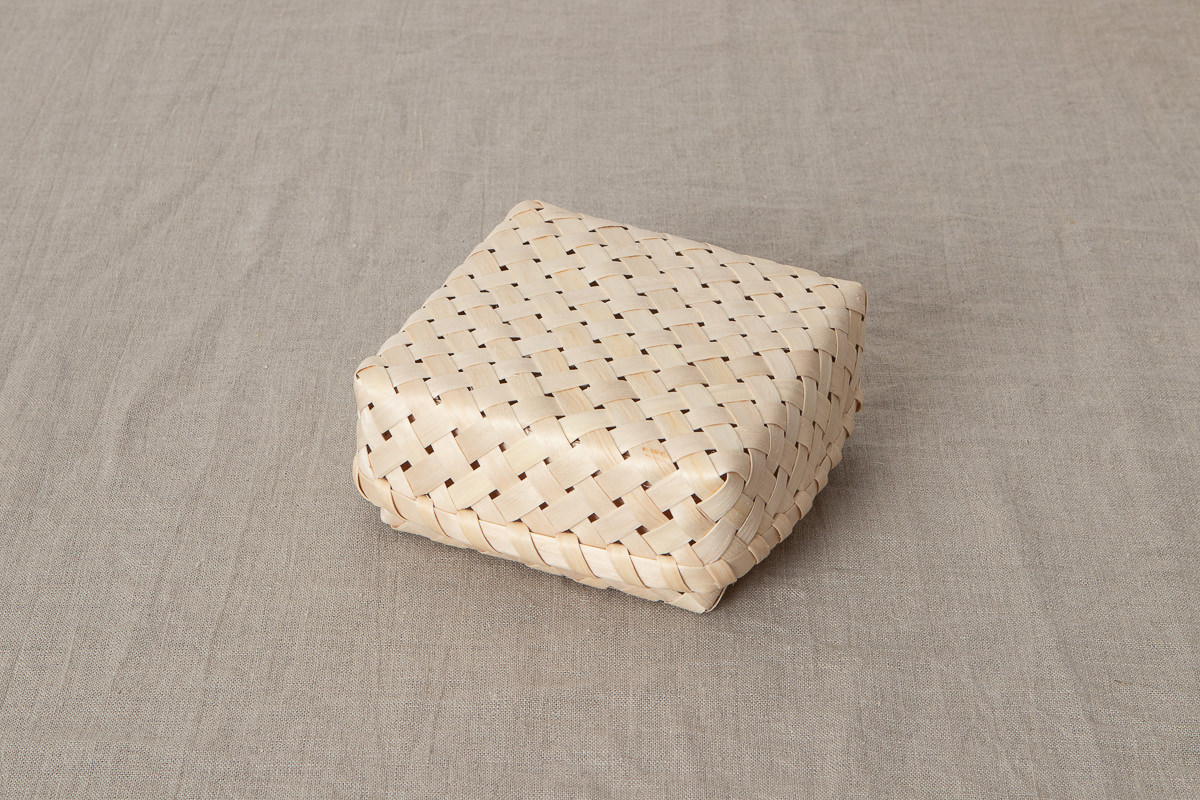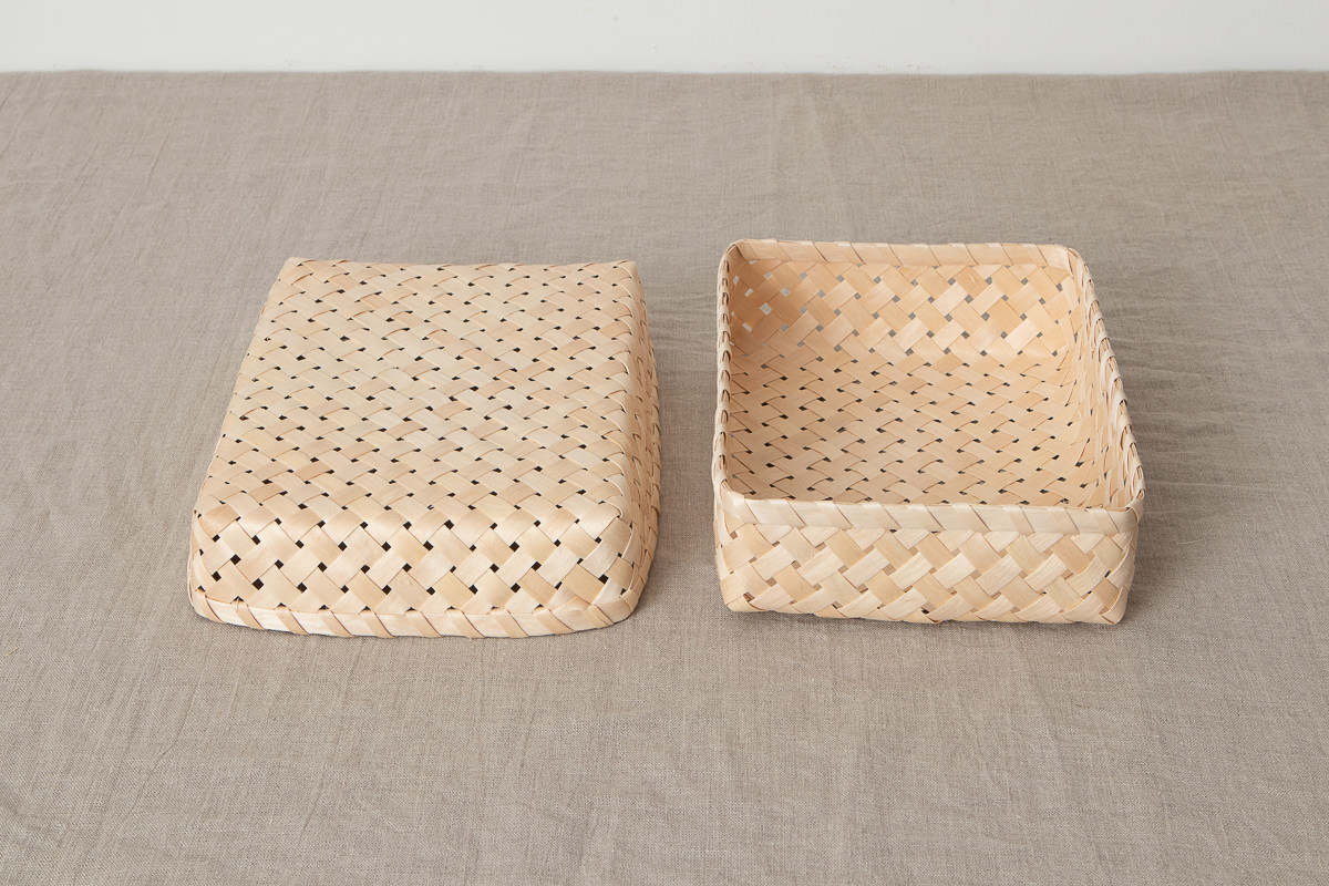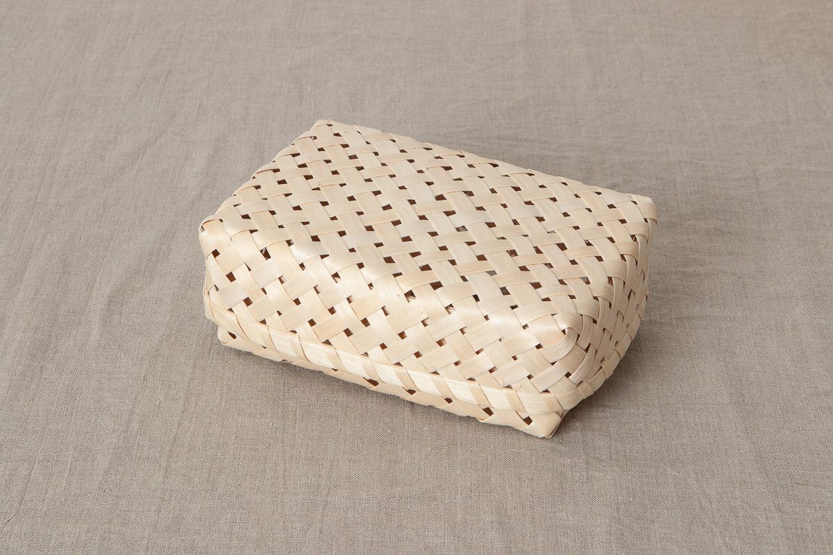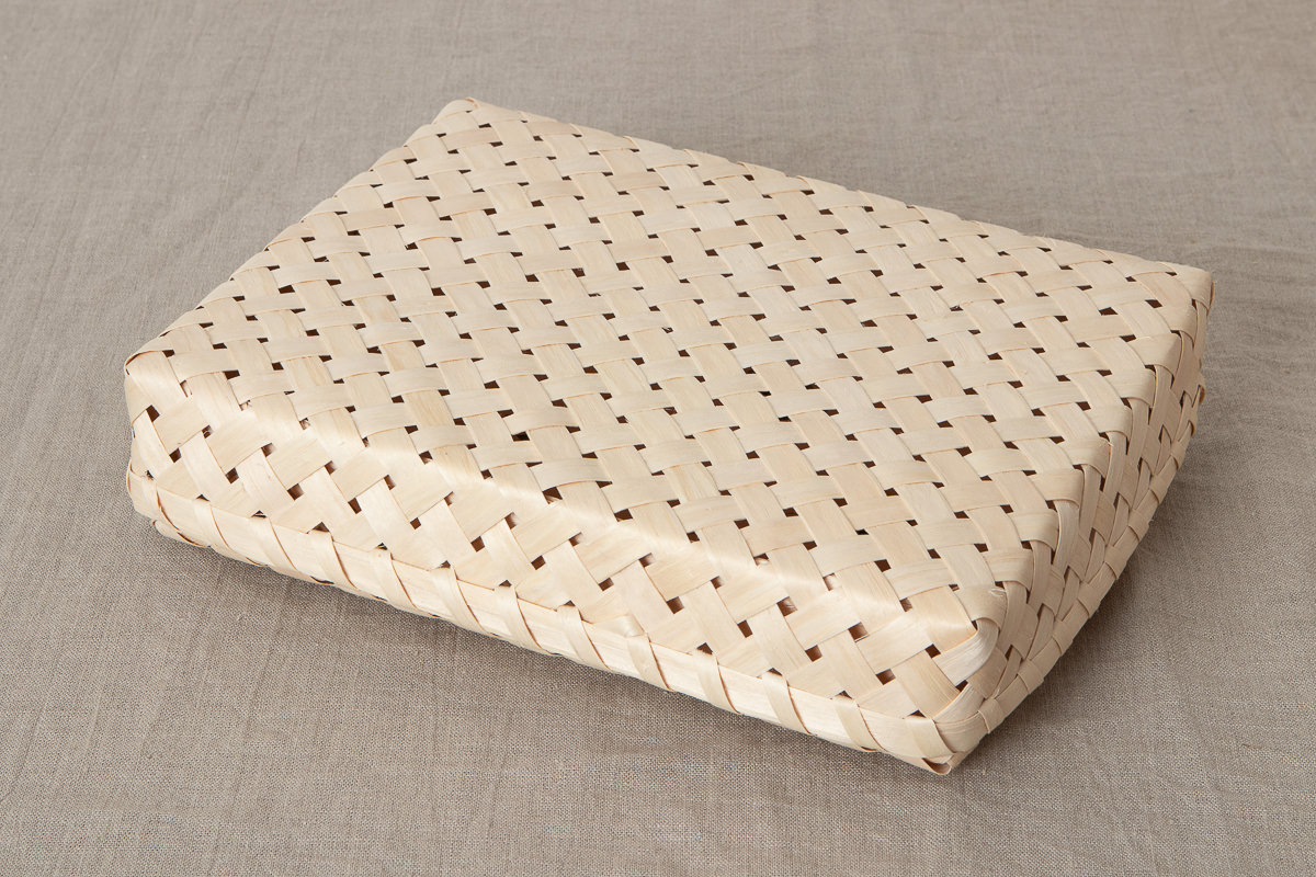 こちらは二番目に大きい「小文庫」サイズです。小文庫サイズはイタヤカエデに限らず、竹細工においても定番のサイズです。お弁当箱としてはもちろん、文房具やノートなどをまとめたり、薬箱としても。それをそのまま棚に収納するにもちょうど良いサイズです。