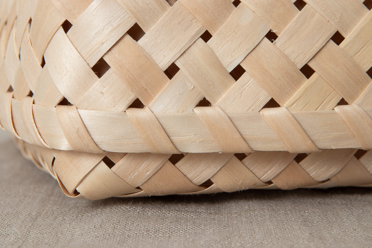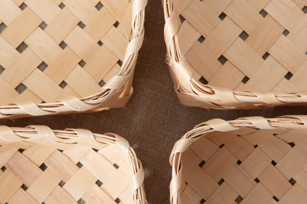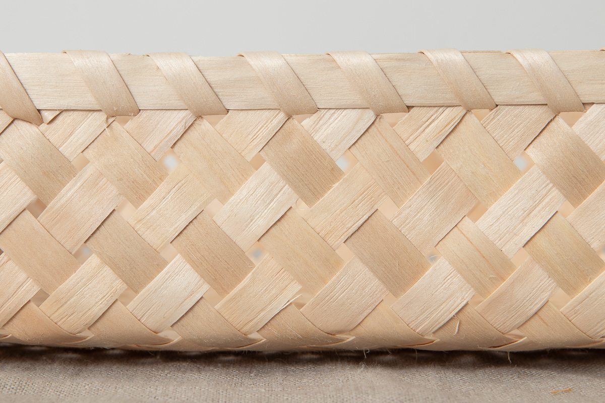 かご全体は、四つ目編みという、小さな菱形のすき間を作るような編み方で作られています。縁はテープ状にしたイタヤカエデをぐるりと回した後、それを同じくイタヤカエデでかがって留めています。