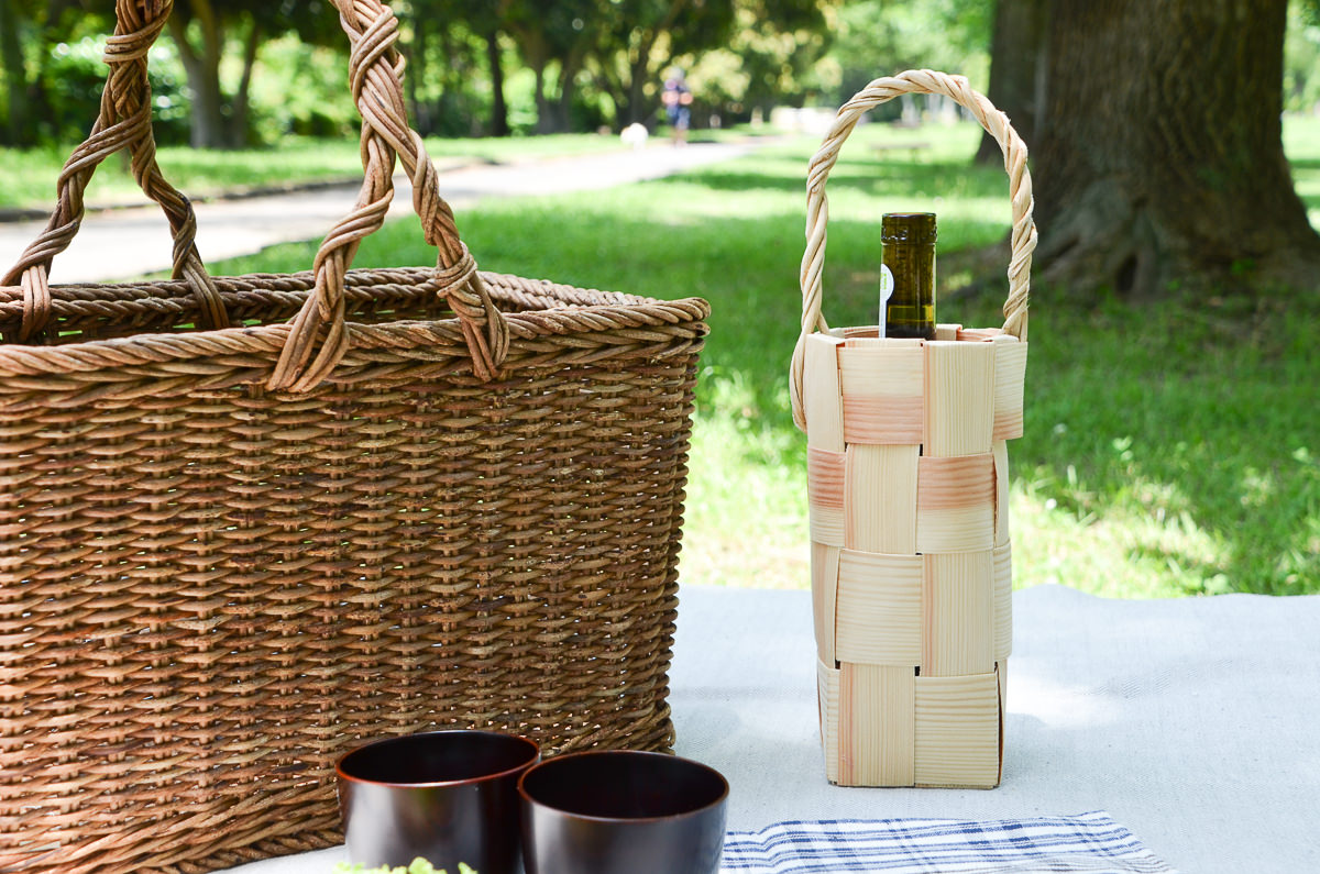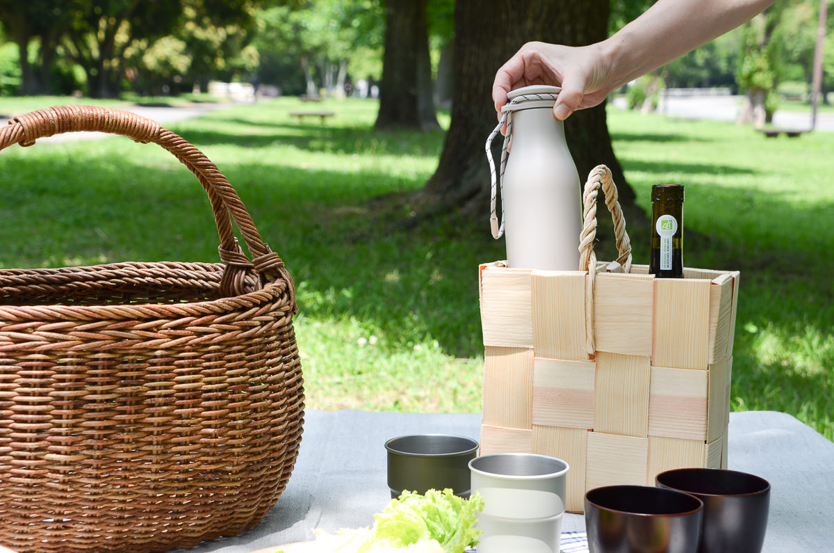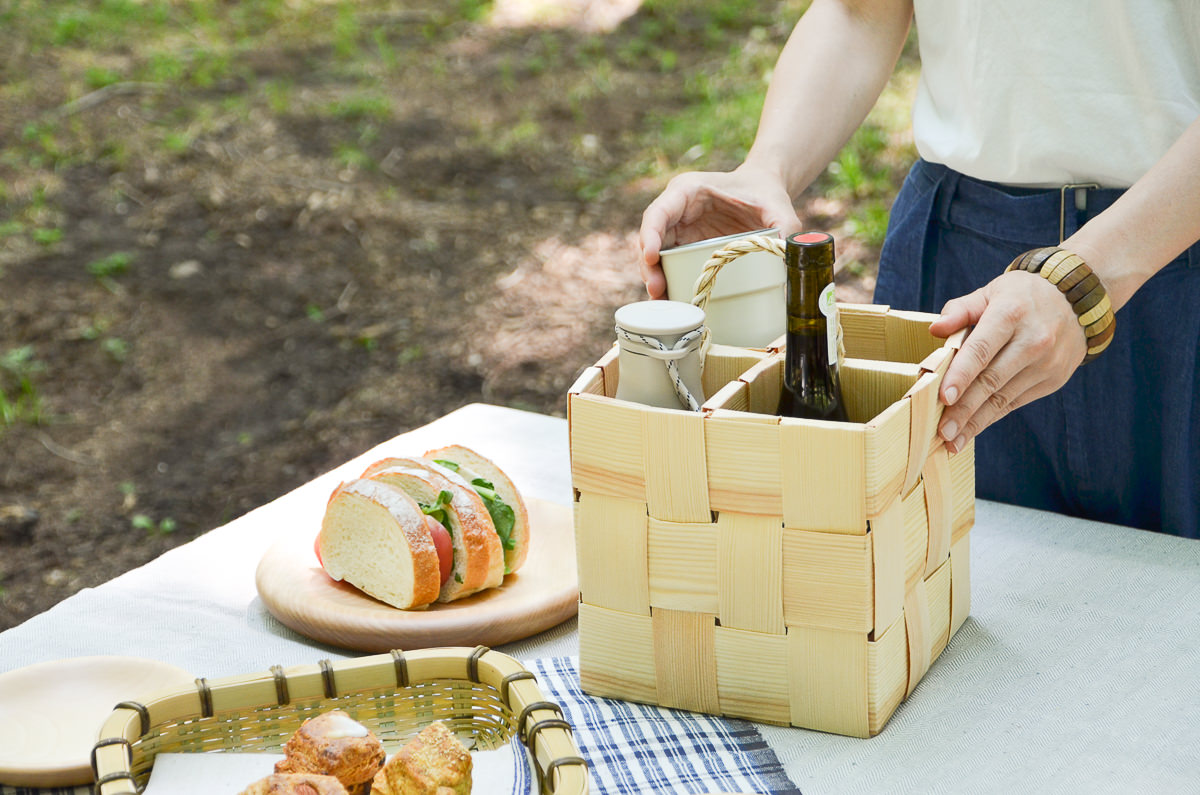 ピクニックやキャンプにて、細長いボトルは置き場が芝生の上で不安定だったり、気づかないうちに肘などで倒してしまったりすることもありますが、このボトルバスケットに入れてあるとだいぶ落ち着きます。