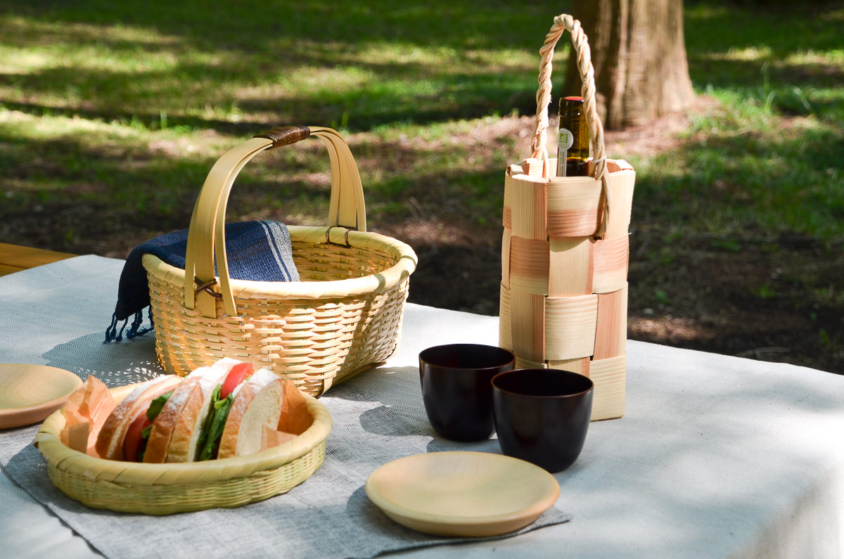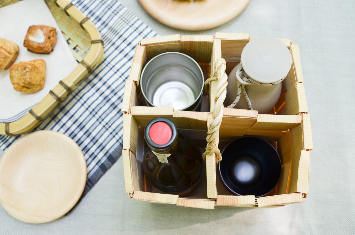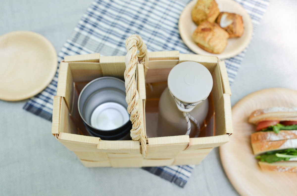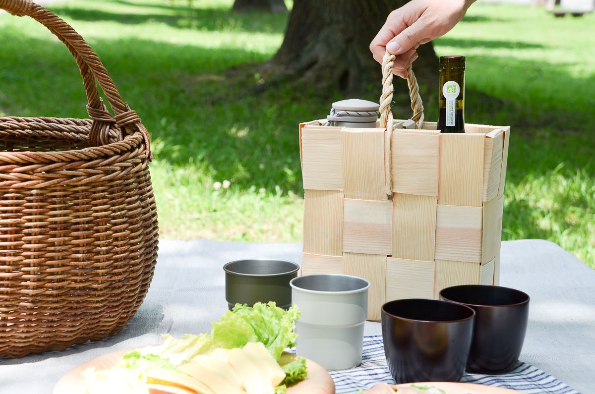 ピクニックやキャンプにて、細長いボトルは置き場が芝生の上で不安定だったり、気づかないうちに肘などで倒してしまったりすることもありますが、このボトルバスケットに入れてあるとだいぶ落ち着きます。