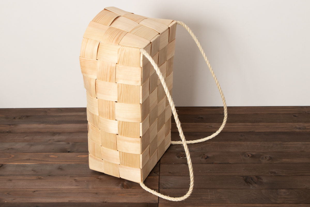 この背負いかごの特徴はなんと言ってもその形と斬新かつ、シンプルな紐の通し方です。
