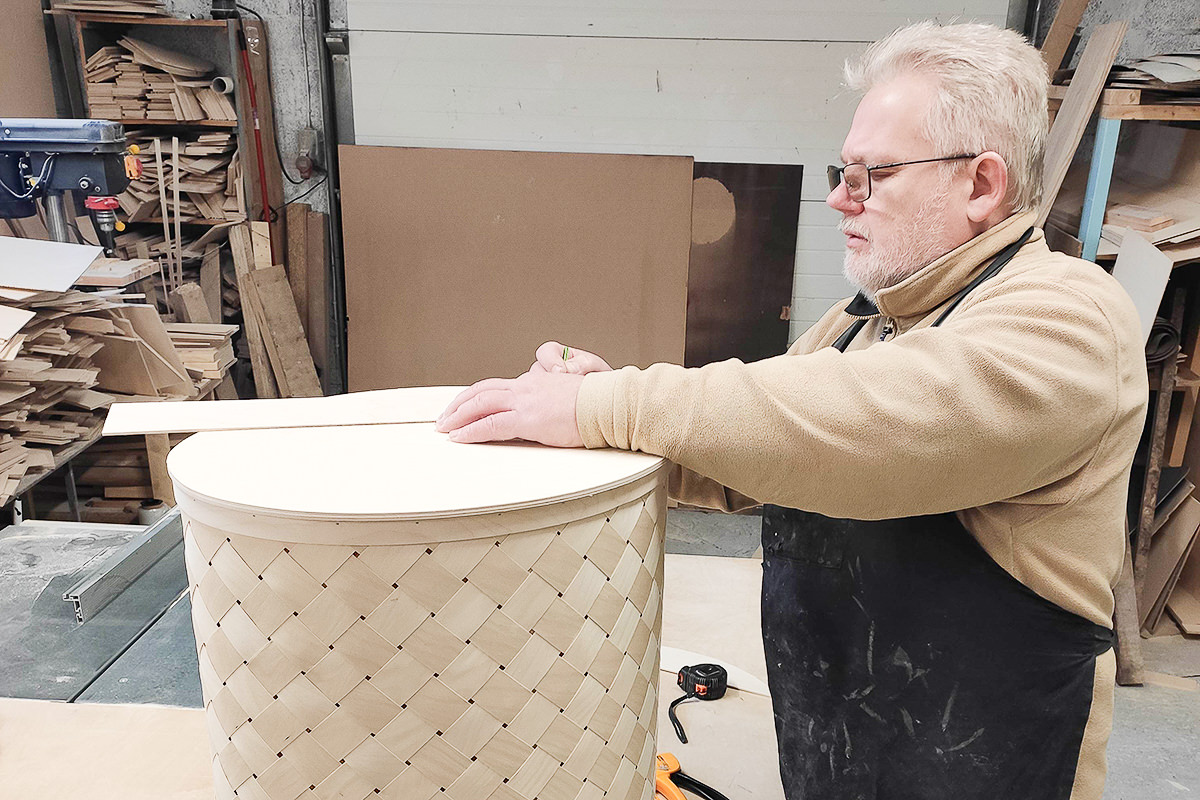 一方、バーチ(白樺)を素材にし、自身の先祖が作っていた伝統的なかご作り技術にデザインを加え、