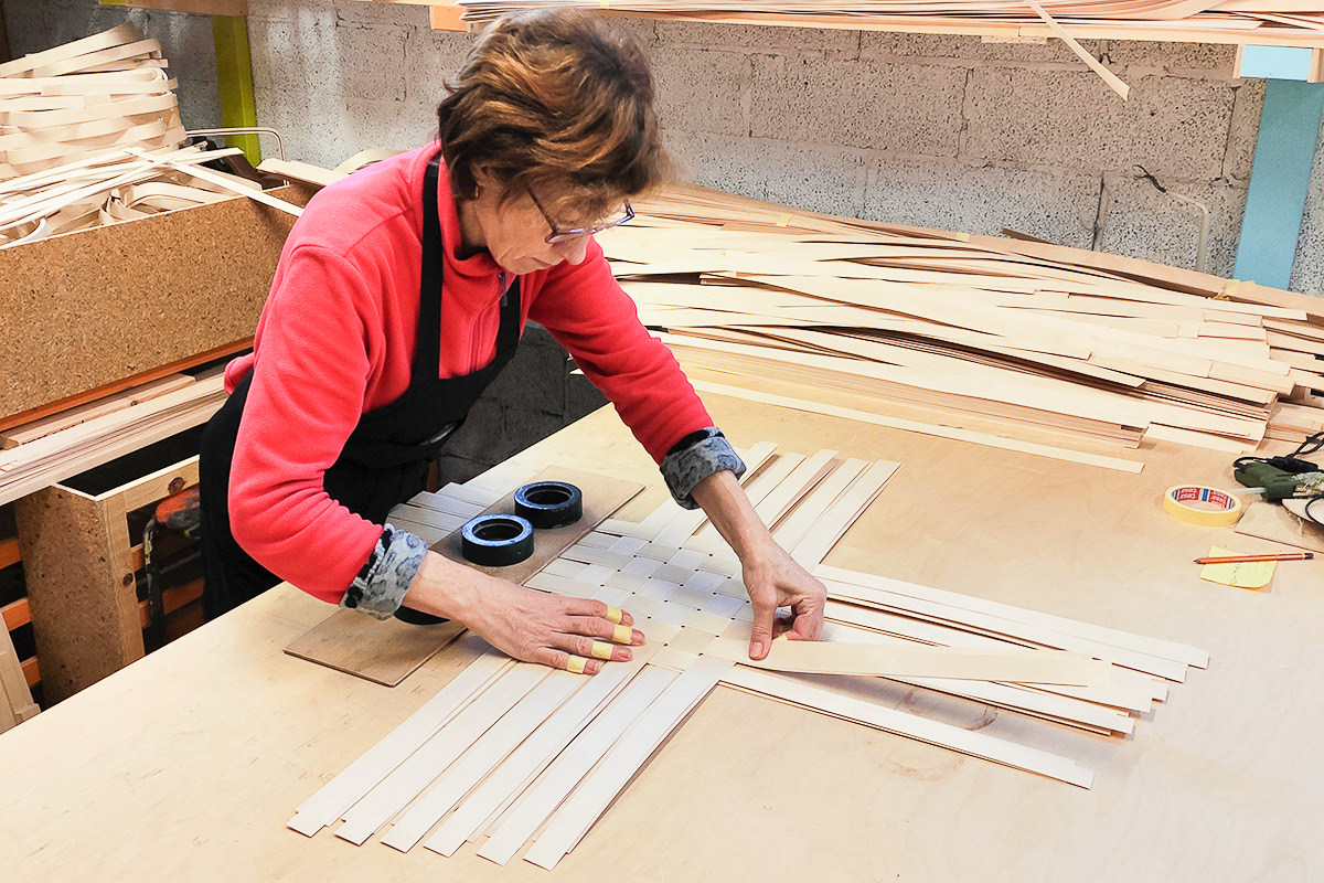 幅をほんの少し変えて、2枚重ねにして編んでいます。節がなく、美しい木目を見ることができます。