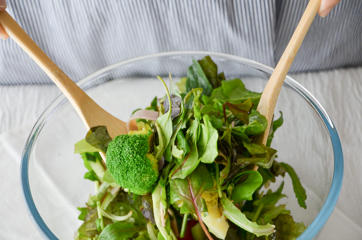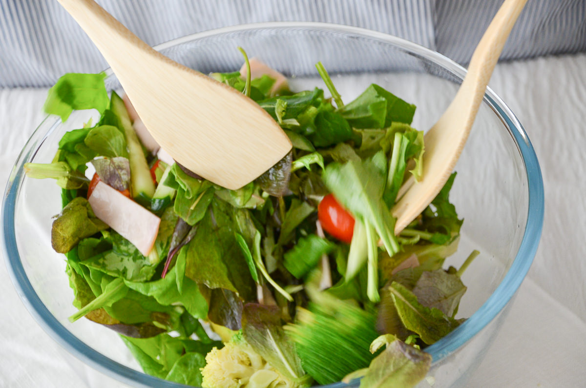 大きなボウルにたっぷりのサラダをドレッシングと和えたり、お皿に盛りつけたり。