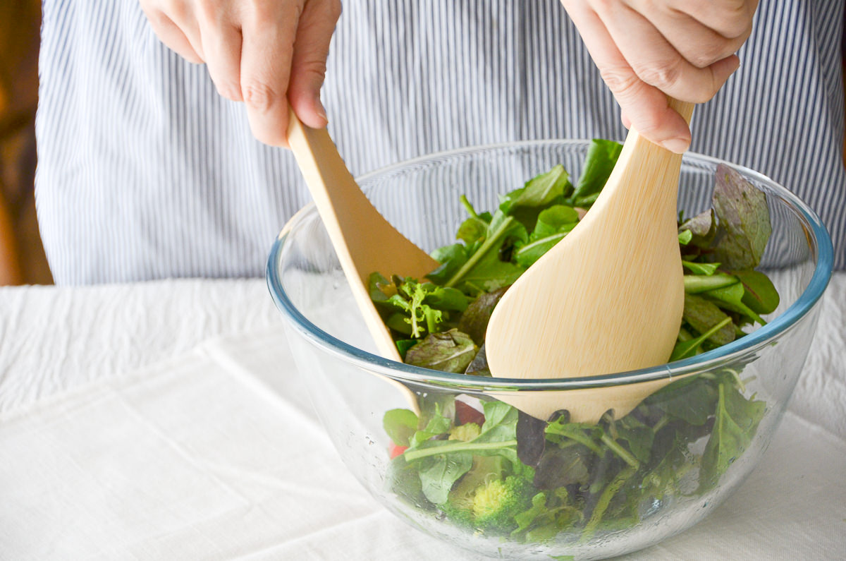 たっぷりのサラダをドレッシングと和えたり、お皿に盛りつけたり。