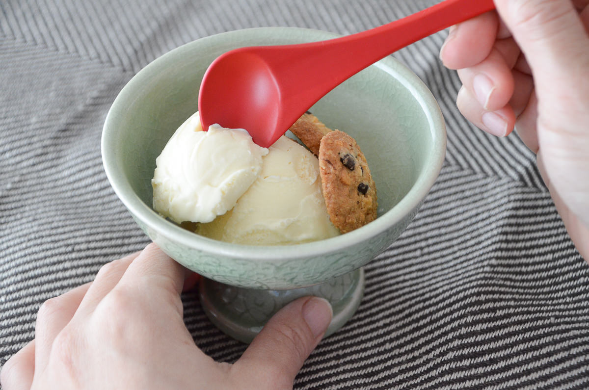 こちらは「生成り」と「赤」、二種類の色がある、アイスクリームスプーンです。