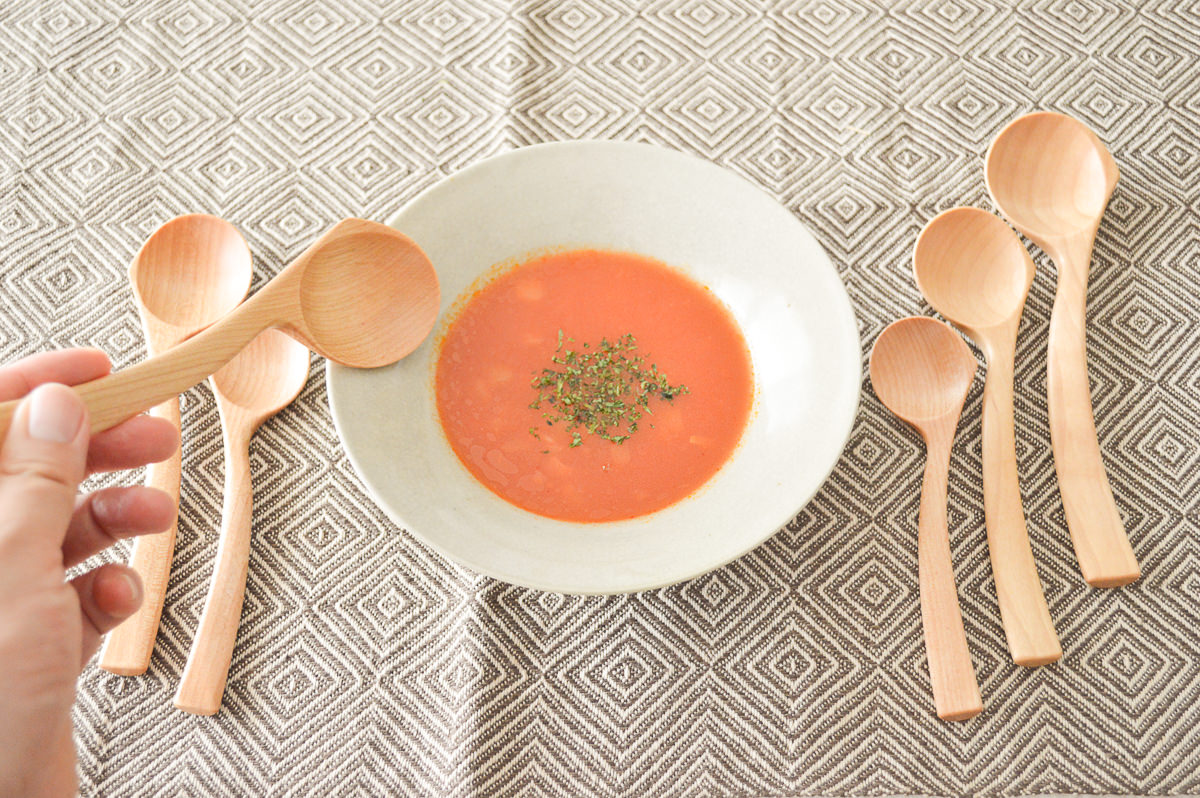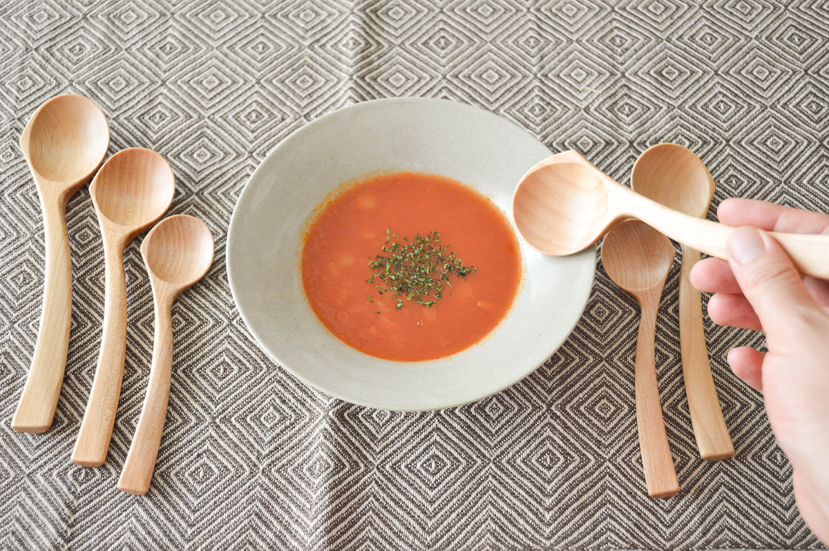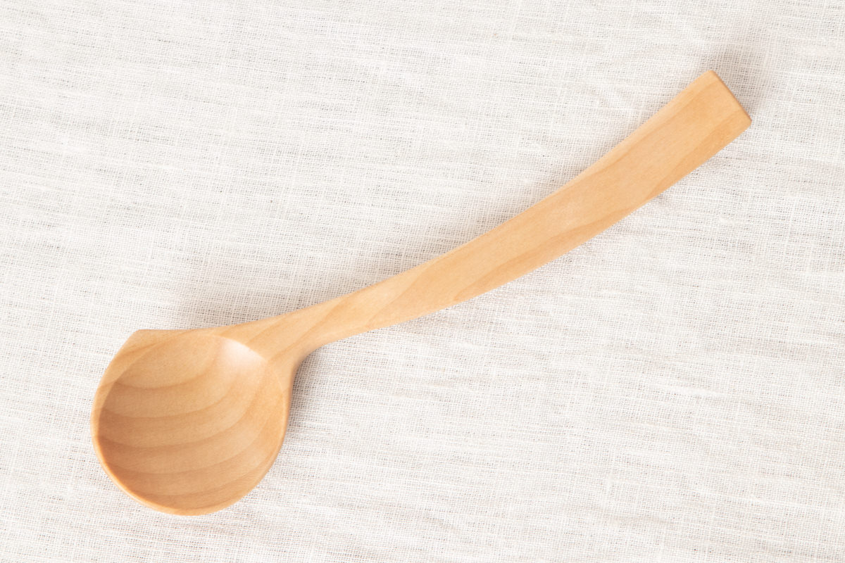シンメトリーのスプーンならではの向かい合ったような造形です。生成り仕上げのため、主張が強いわけではありませんが、ミズメの素材感を十分に楽しむことができます。
