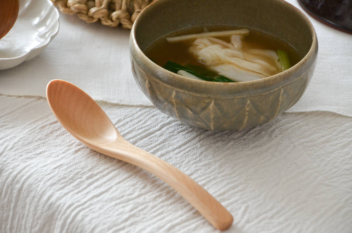 ミズメ材の厚みを十分に使い、しっかりとスプーンの先端に向かって角度をつけています。スッとスープなどをすくうことができます。
