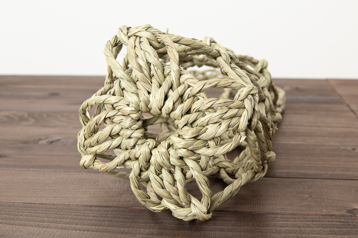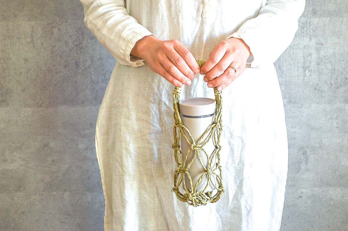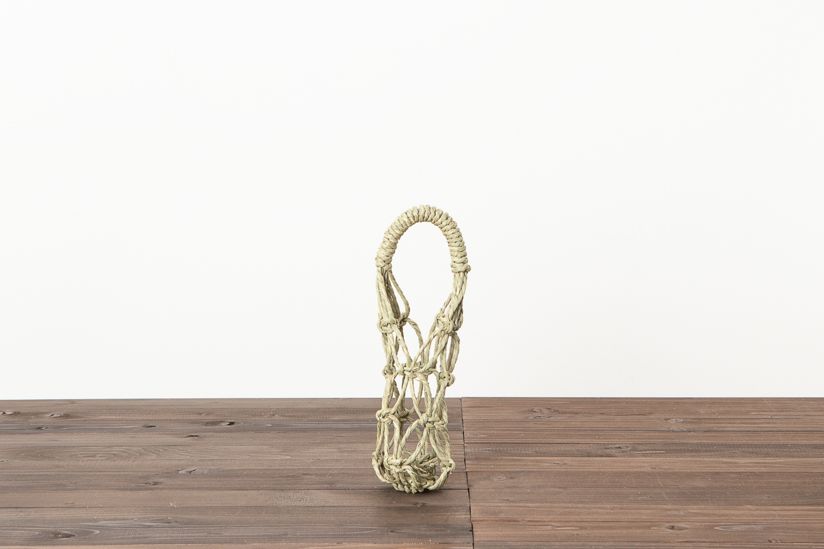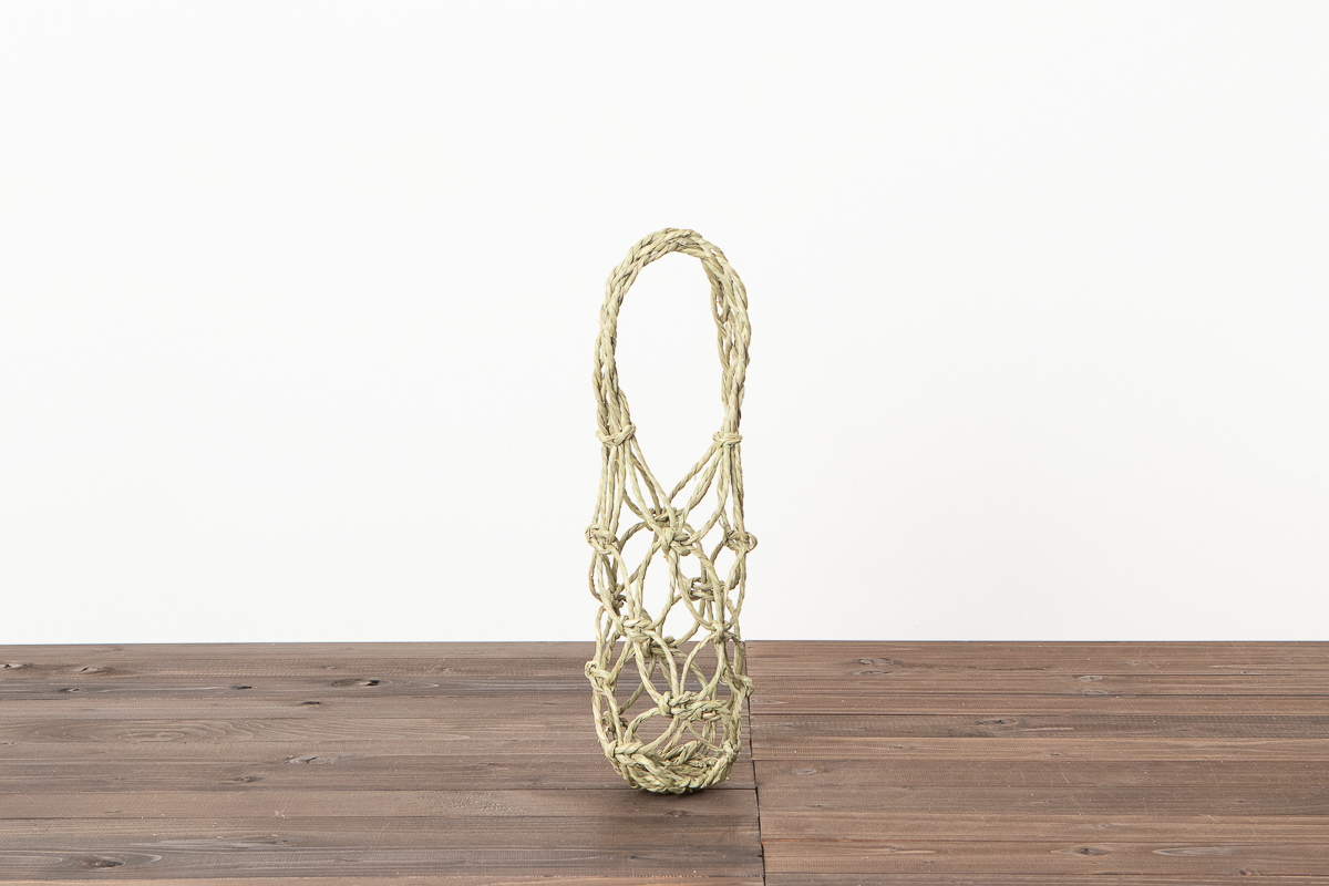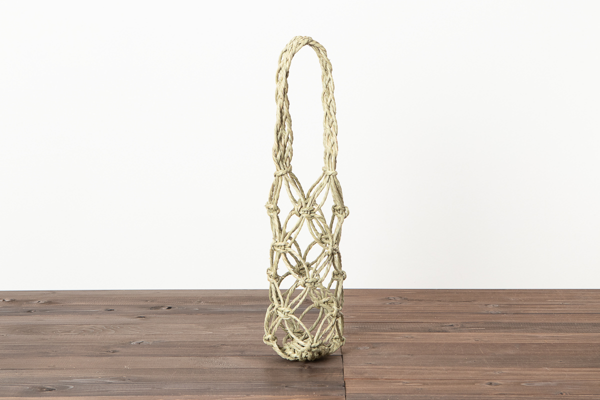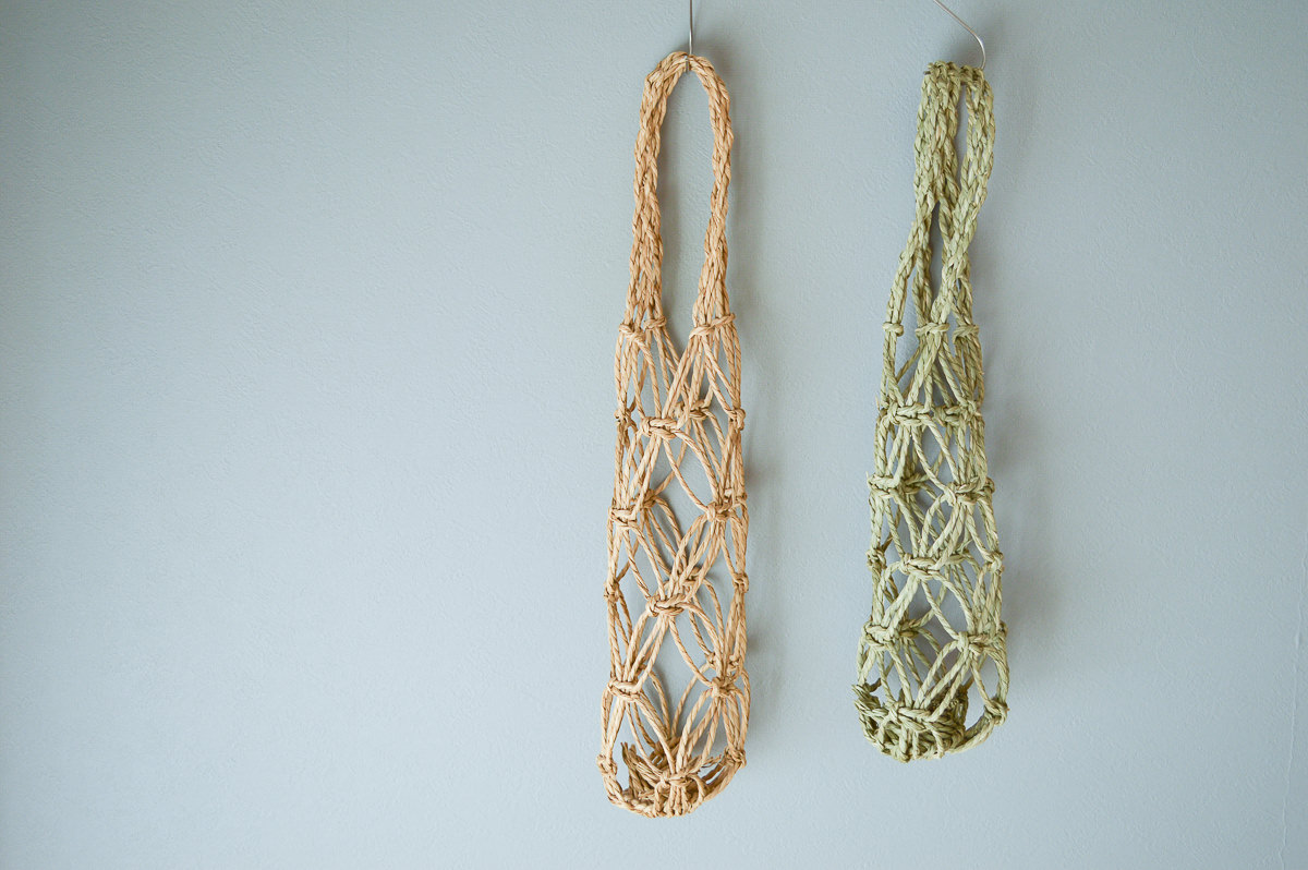 「七宝(しっぽう)編み」や「マクラメ編み」と呼ばれる技法で編んでいます。素材は柔らかく、中に何も入っていなければギュッと絞ることもできて、使い勝手の良いかごです。