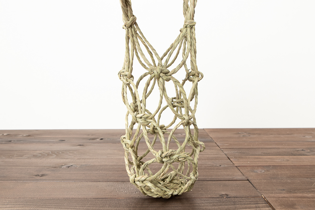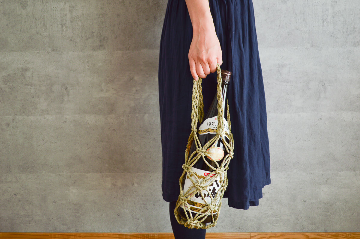 中サイズと大サイズは、ミニサイズと違い、昔からの仕様のままの持ち手です。この持ち手で一升瓶を不安なく、運べます。よられた縄の強さを実感します。元々はしょうゆやみりんなどの液体調味料をお店で詰め替えてもらうときに