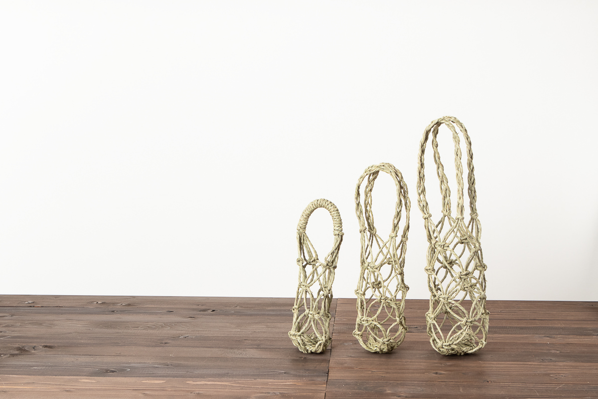 生地状に織っていきますが、こちらのびんかごはすべて手編みで仕上げています。大きさは写真左からミニ、小、大の3サイズです。