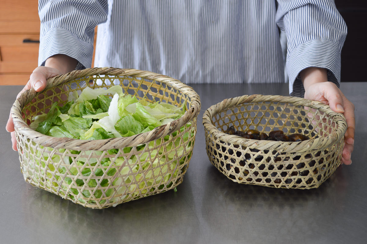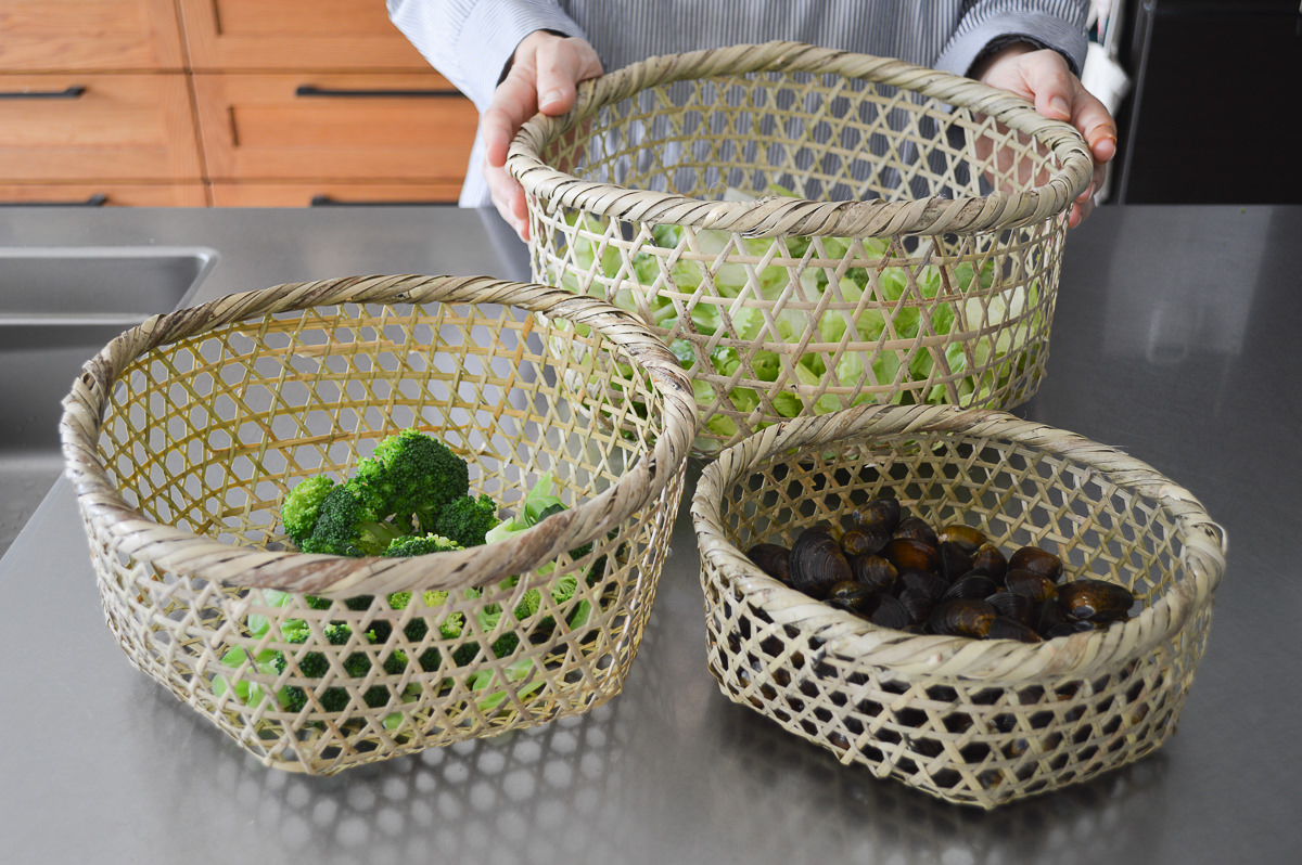 縁に真竹を使用しないなど、いわゆる篠竹だけを使った昔ながらの素朴なざるやかごは、数名のご高齢の方々が作るもののみとなっています。