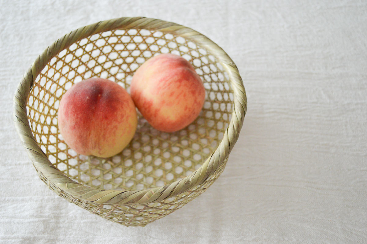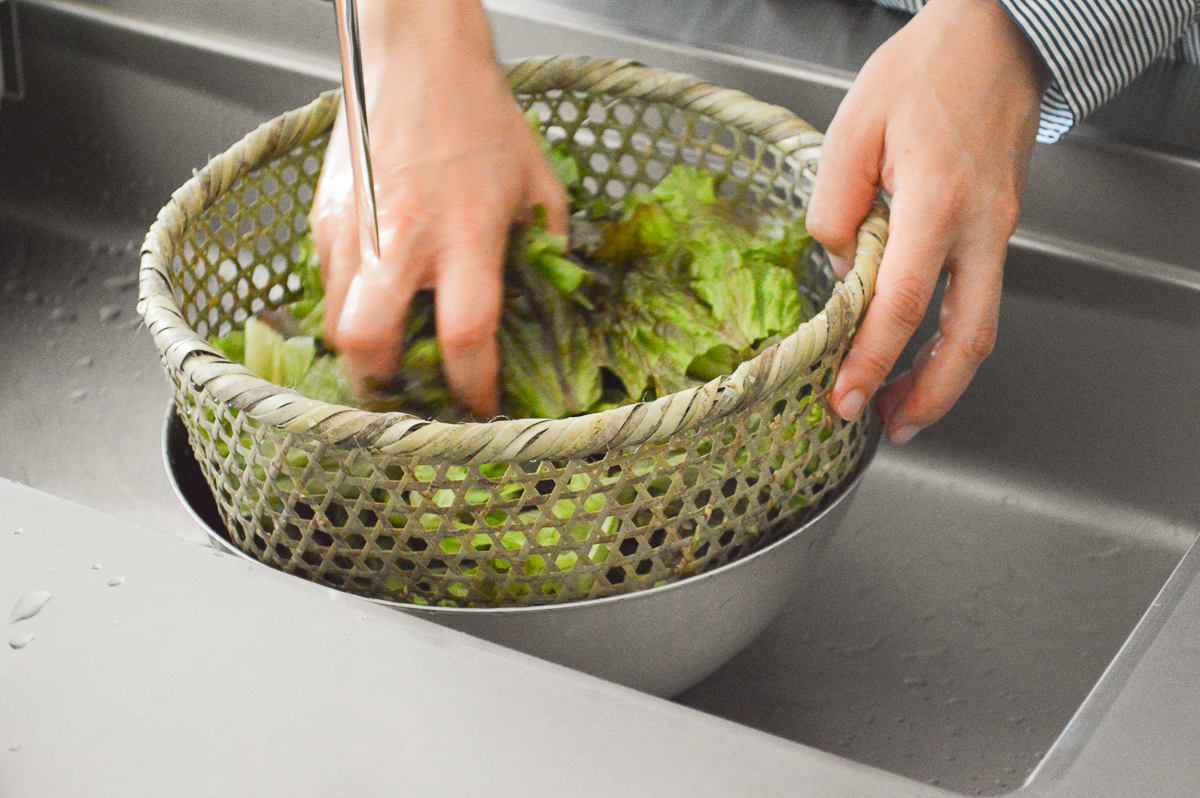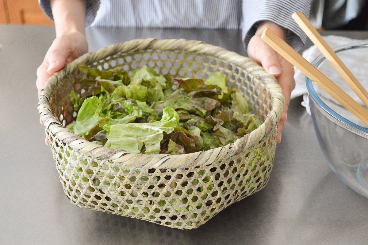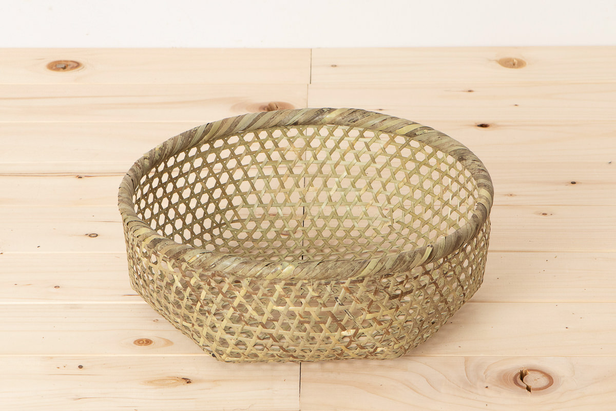 このかごのように六角形の目が開いたかごのことを、「目かご」や「目ざる」と呼びます。この目があいていることで、野菜や貝などについた汚れが編み目からスルスルと落ちるようになっています。
