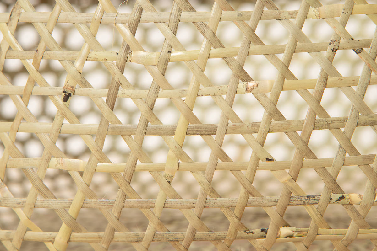 底面は力竹のような補強がなく、篠竹は比較的柔らかい素材のため、手のひらを当てて軽く押すと、ペコっと凹むような仕様になっています。それこそが篠竹のしなやかさを表わしていて、硬い素材と違い、簡単にパキッと折れにくいです。また、それが手当たりの柔らかさにもつながります。