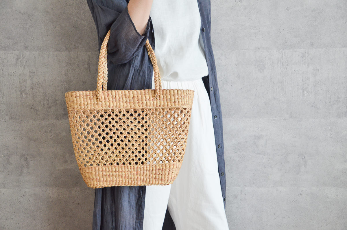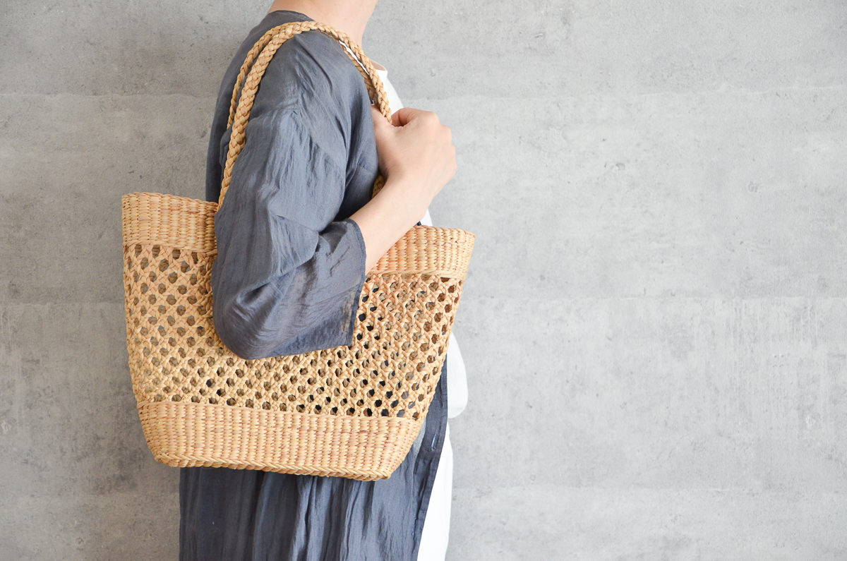写真:Mサイズスリムな形と涼しげな編み目が魅力的なウォーターヒヤシンスの手提げ。