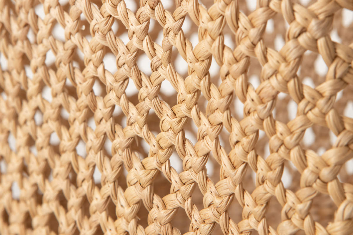 かごのベースは日本でいうところの「ござ目編み」で、縦ひごに横ひごを前後交互に編み込んでいく形です。透かし編みもこちらのござ目編みもとても細やかな編み目です。