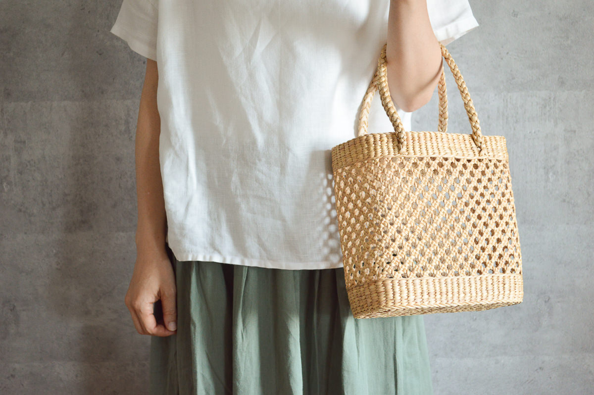写真:Mサイズスリムな形と涼しげな編み目が魅力的なウォーターヒヤシンスの手提げ。