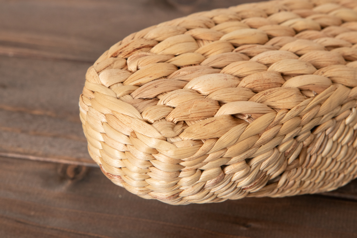 ウォーターヒヤシンスは、収穫してから天日干しでよく乾かし、燻蒸(くんじょう)処理をします。燻すことで、素材の水分がとんで材料として安定し、虫が寄りつきにくくなる効果も期待できます。燻蒸は、作り手により天日干し後に行う場合と、かごを編み上げてから行う場合があります。