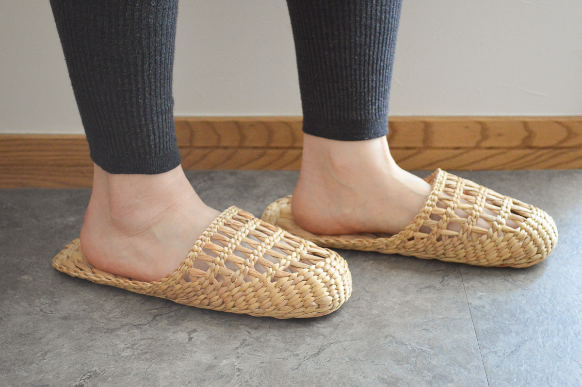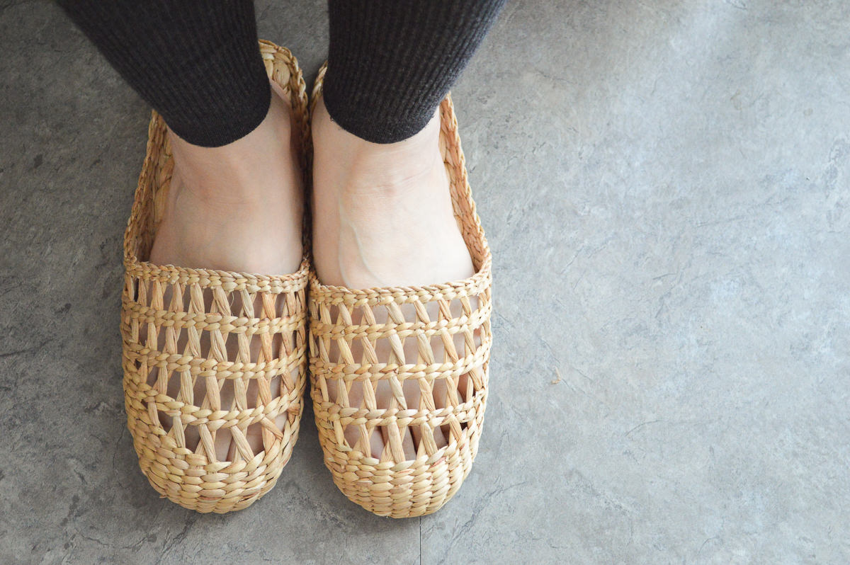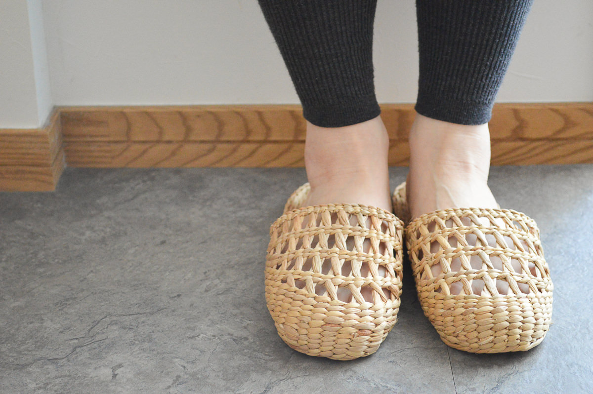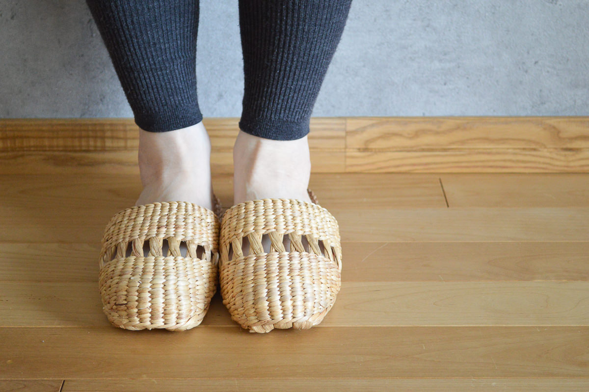 スリッパの中敷にあたるところは、太めのウォーターヒヤシンスを使い、横ひごに縦のひごを前後交互に編んでいく「ござ目編み」仕上げです。