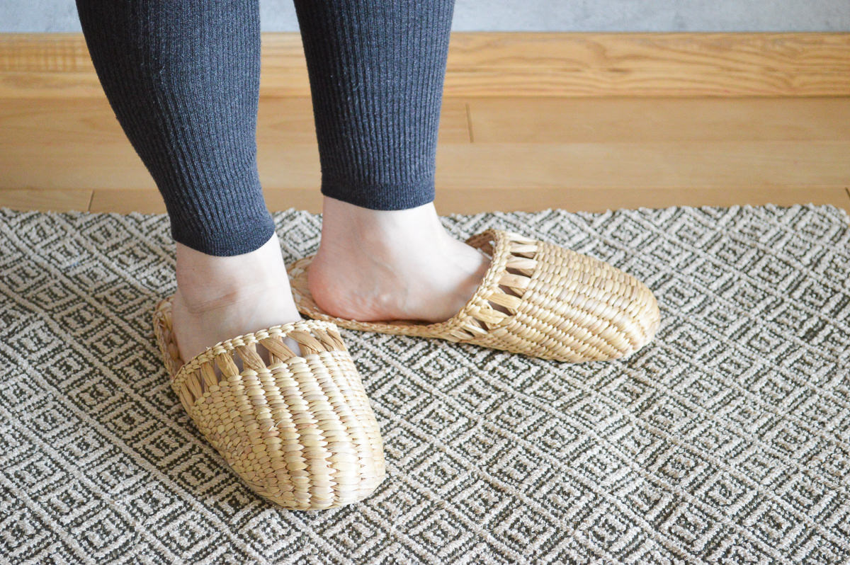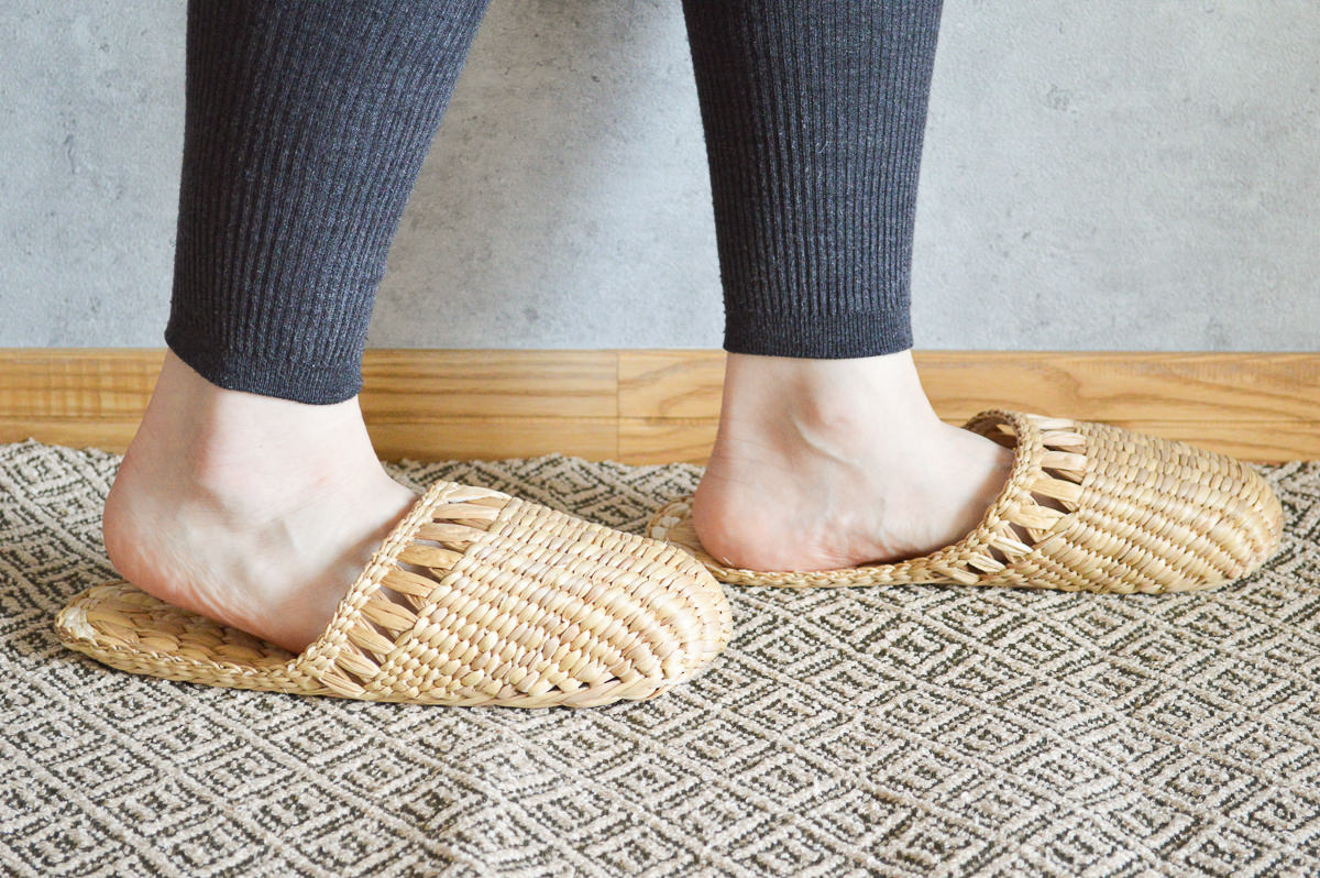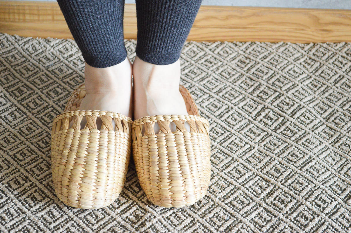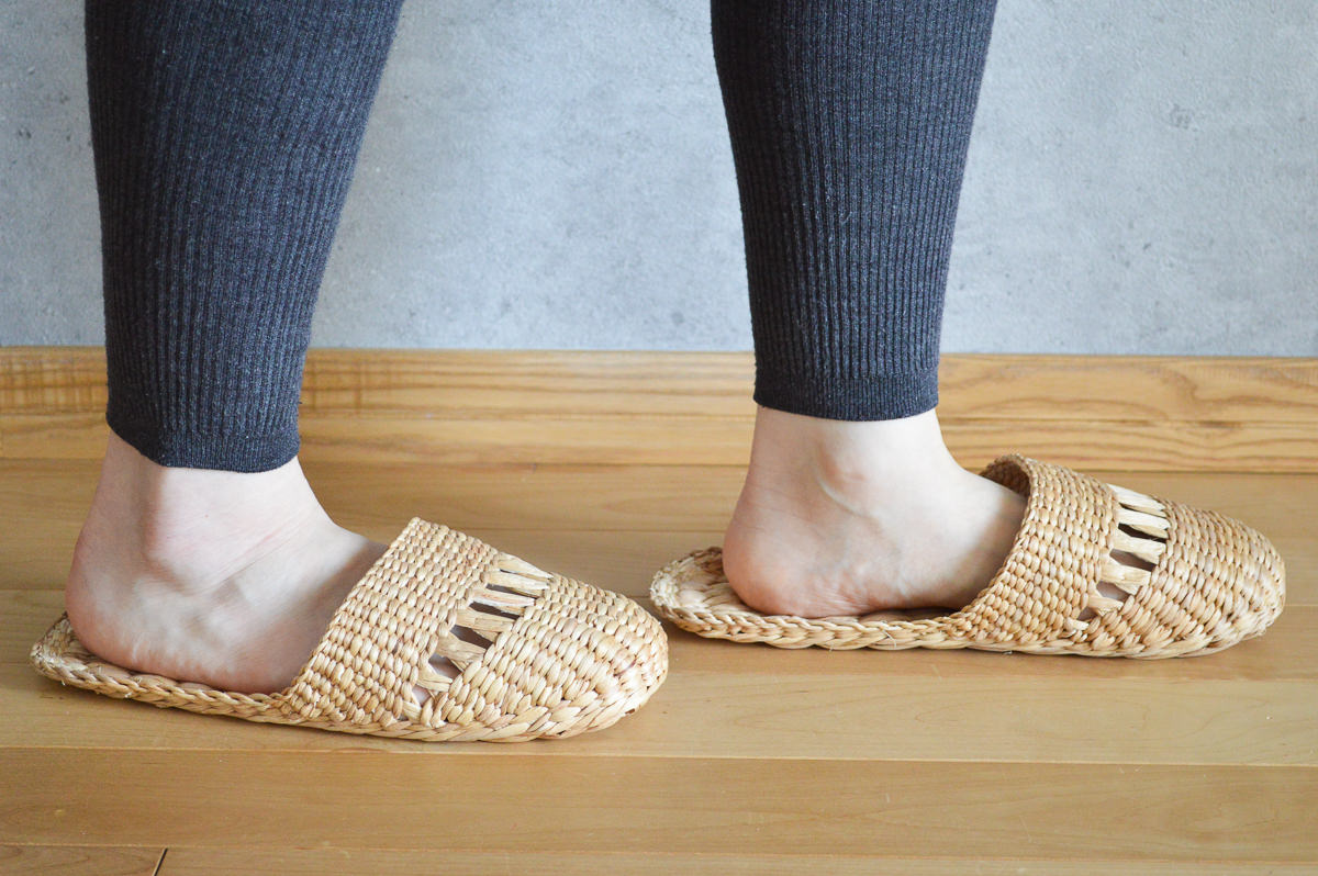 スリッパの中敷にあたるところは、太めのウォーターヒヤシンスを使い、横ひごに縦のひごを前後交互に編んでいく「ござ目編み」仕上げです。