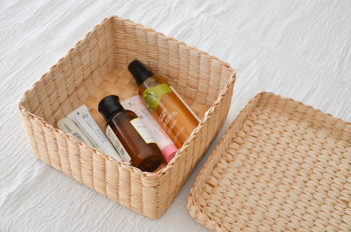 オイルやクリームなど、よく使う日用品を入れて。ウォーターヒヤシンスは特に湿度に弱い素材のため、