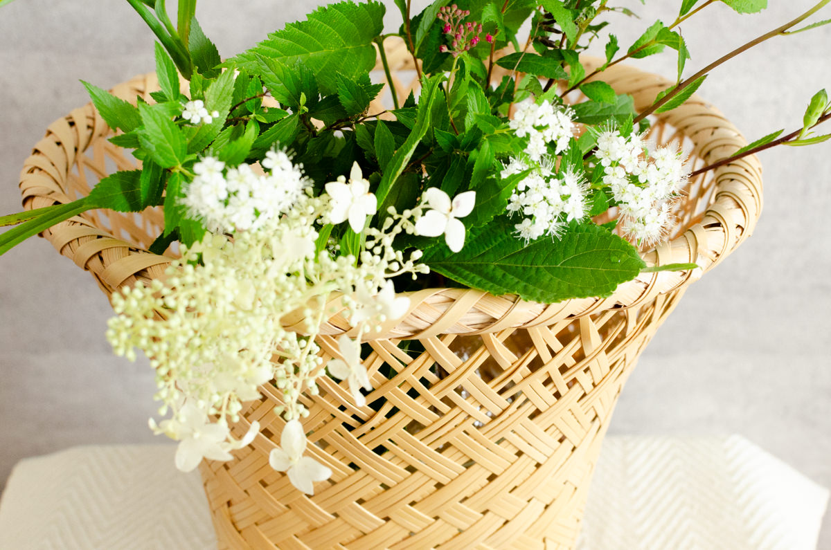 かごの中にガラスの容器を入れて、季節の花を生けるかごとしても。