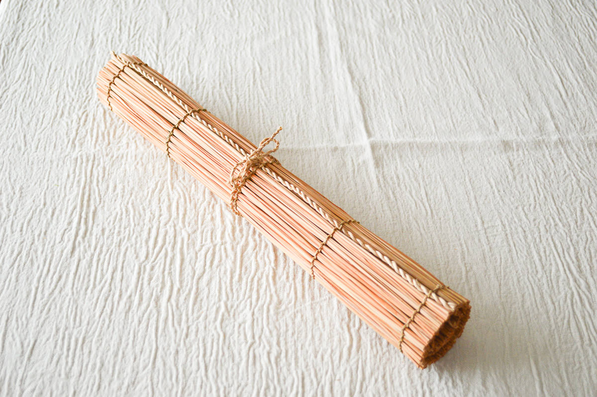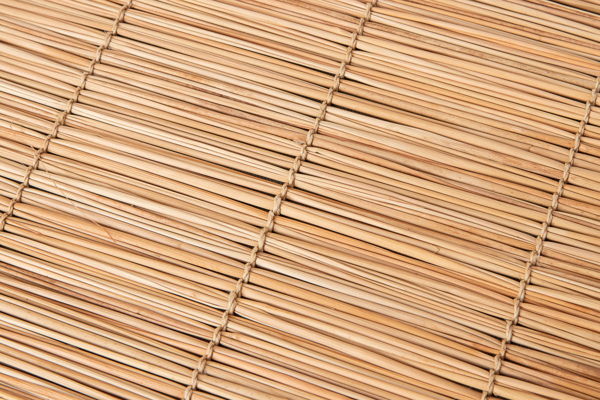 月桃の真っ直ぐに伸びる茎の皮を使います。芯にたどり着くまで皮は何層にもはがすことができ、それぞれを乾燥させます。乾燥させた茎の皮は自然と丸まり、かたくなります。それを「すだれ」のように月桃の縄で連ねていきます。