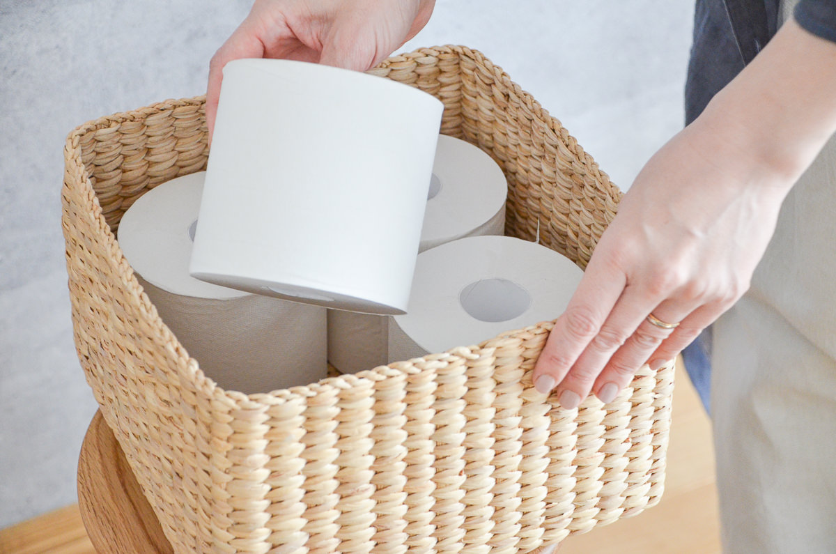 Lサイズに、トイレットペーパーのロールを4つ入れているところです。