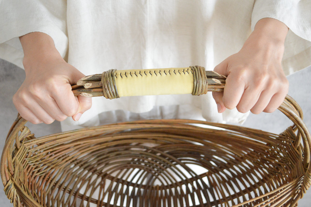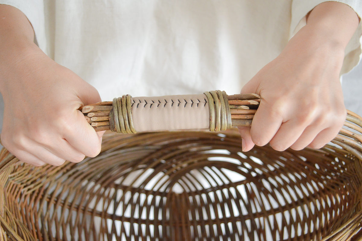 その底面の縦ひごが持ち手として立ち上げられており、やなぎとレザーで固く留められています。