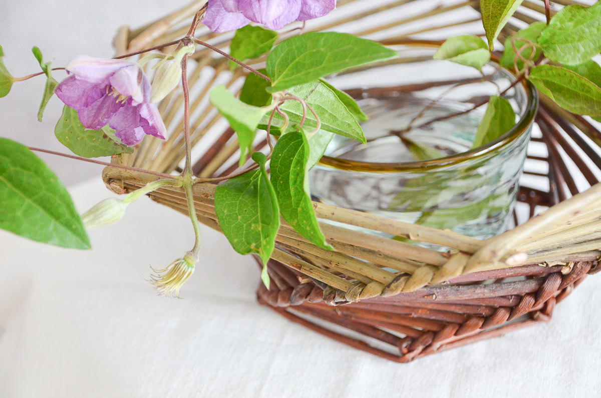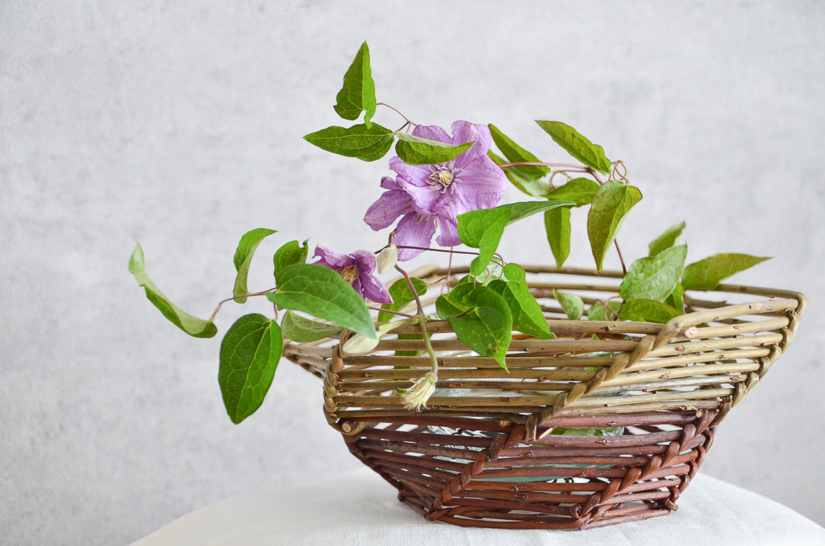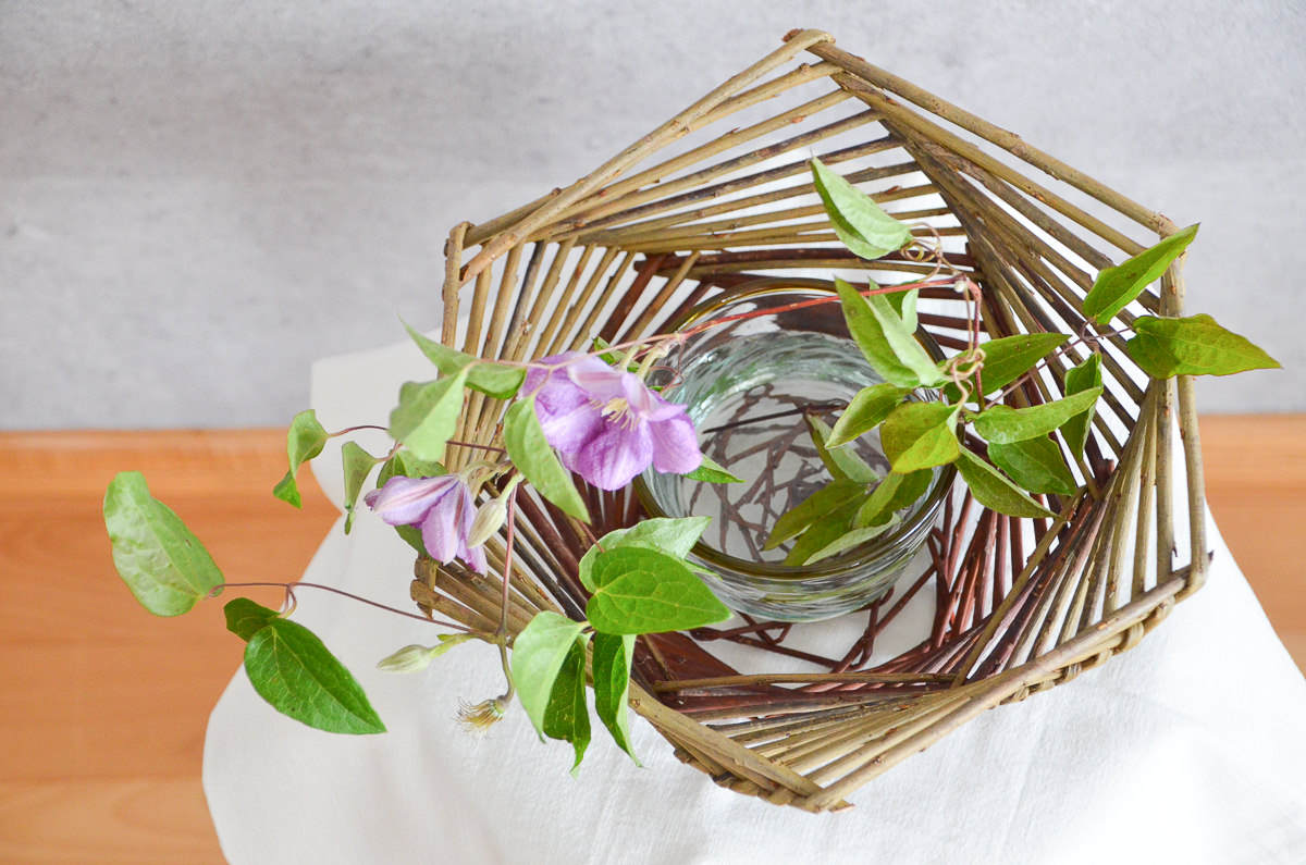写真では、ガラスの小鉢を入れたかごに、クレマチス(鉄線)を活けています。