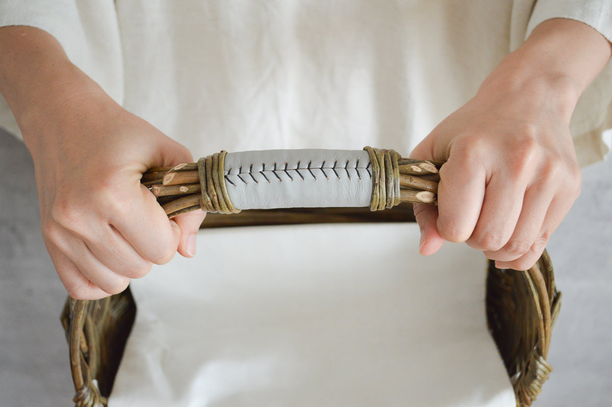 持ち手とかごの接続部に施された、やなぎの装飾がアクセントになっています。