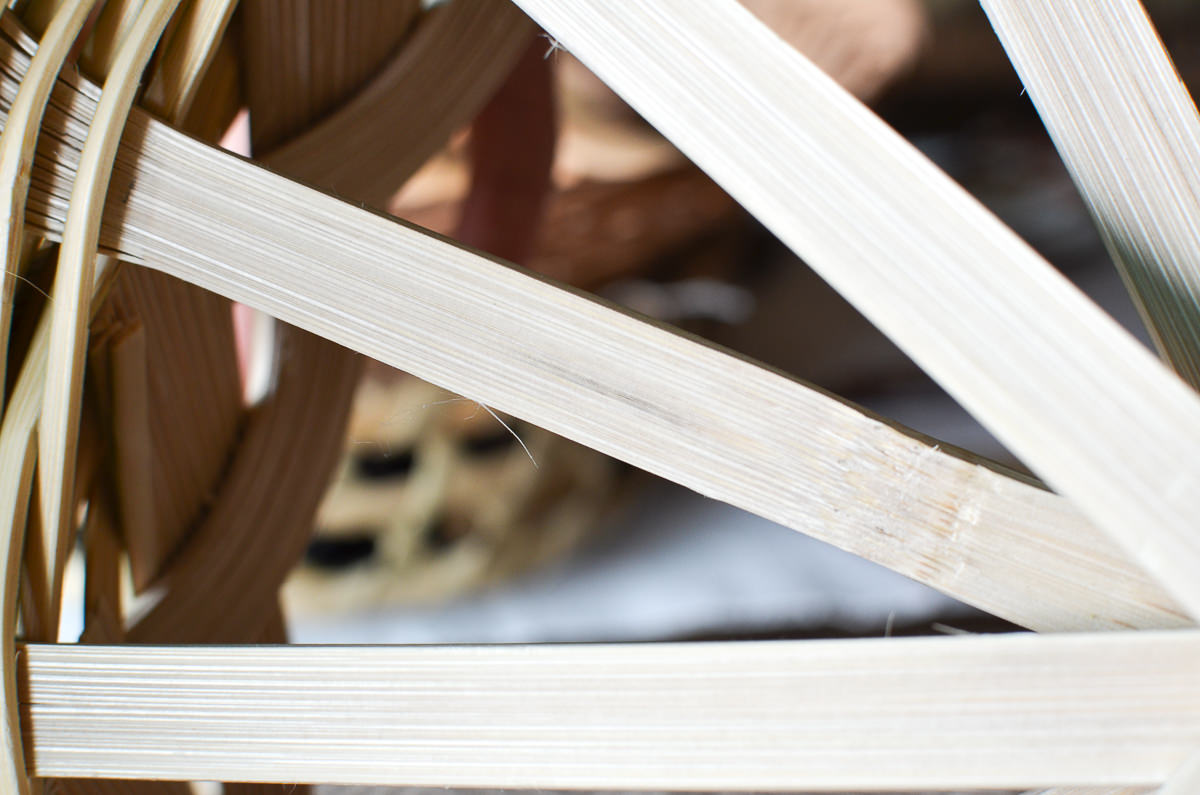 そして、仕上げはこの底の部分で、ささらがバチッと留められています。針金も籐(とう)も使わずに、ただ竹のみを編み込んで留めています。ささら状のひごが光を受けて光沢を放っています。