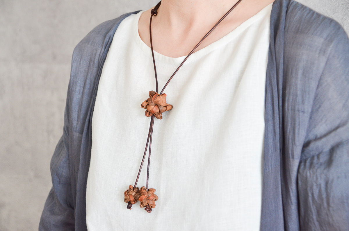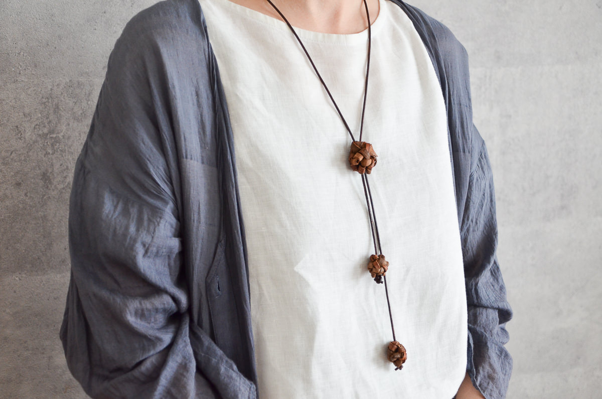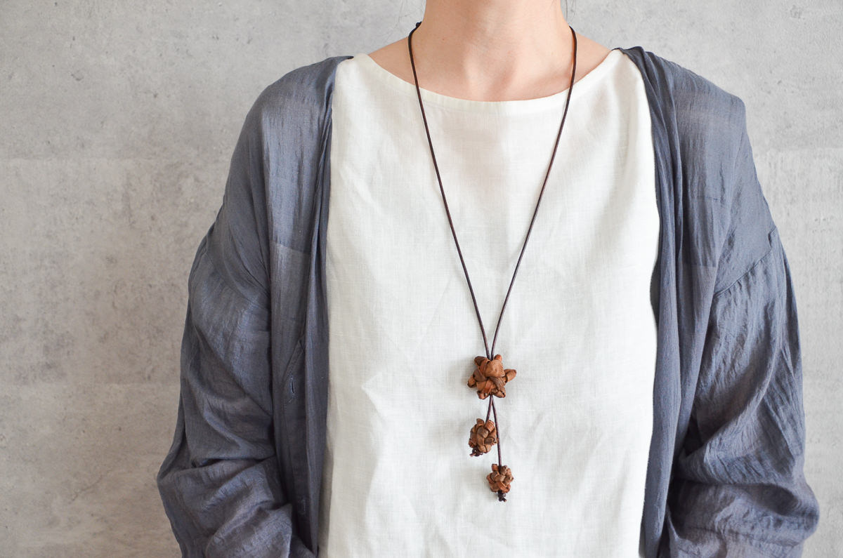 首にかける革ひもはぶどう蔓に合わせた、落ち着いたトーンの丸紐を使用しています。