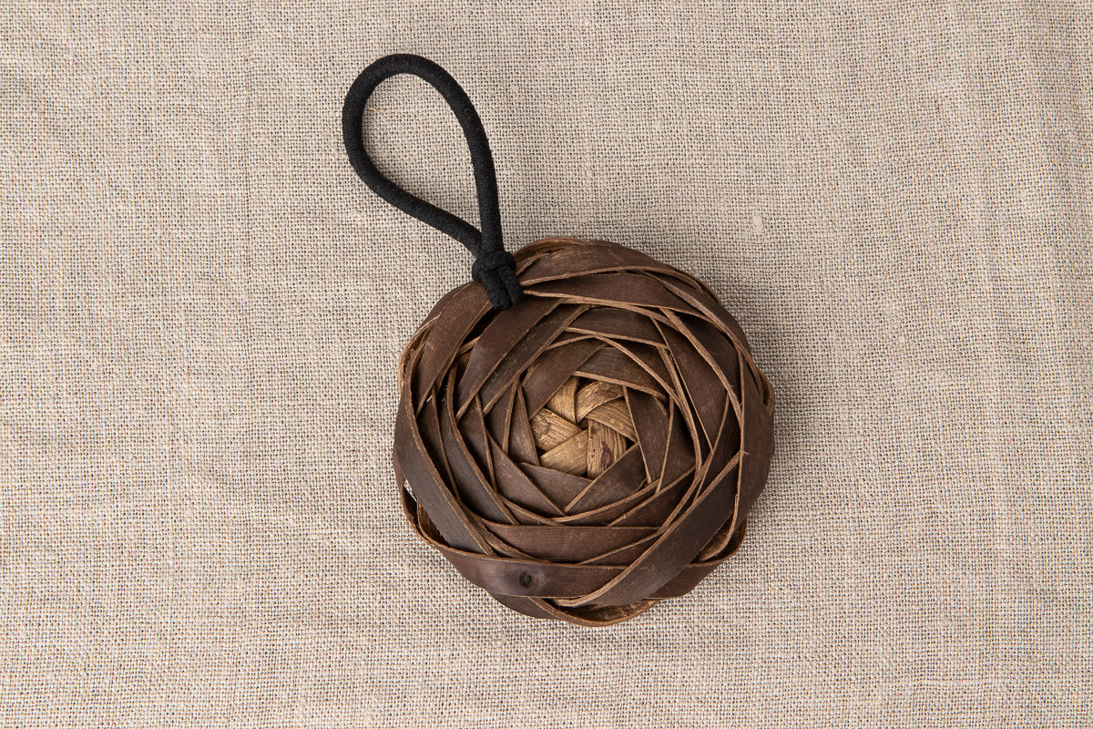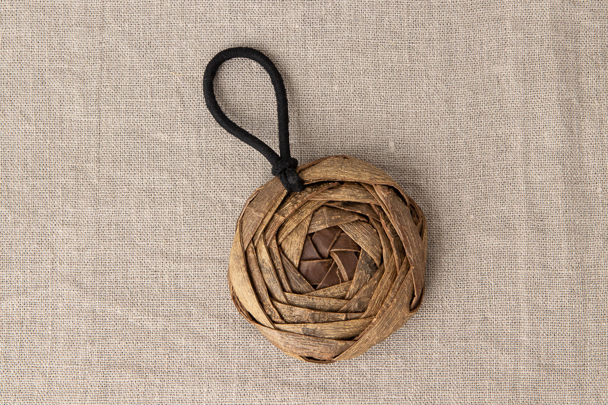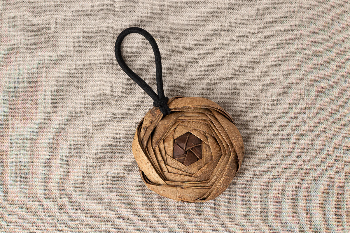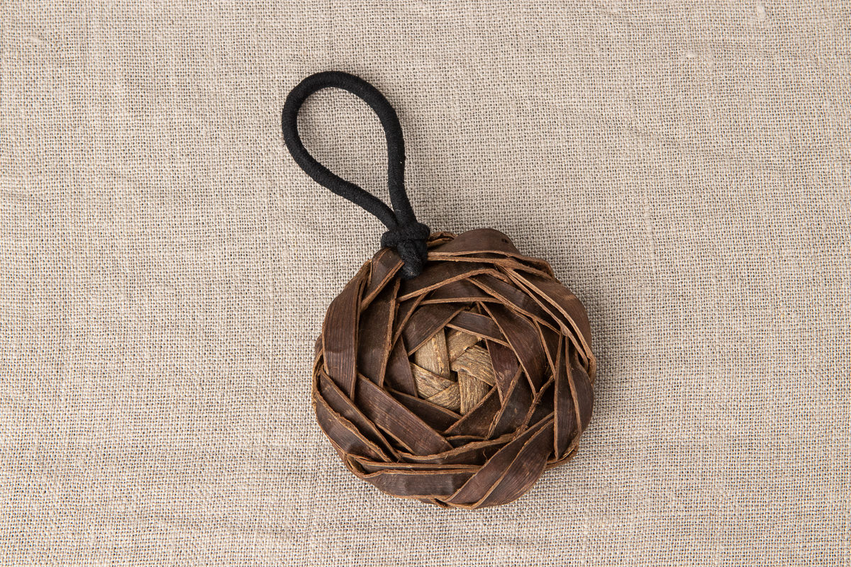 その中でもこちらはくるみの樹皮をバラのような形に編んだバッグチャームです。