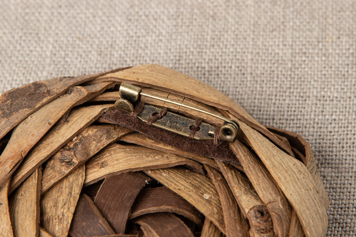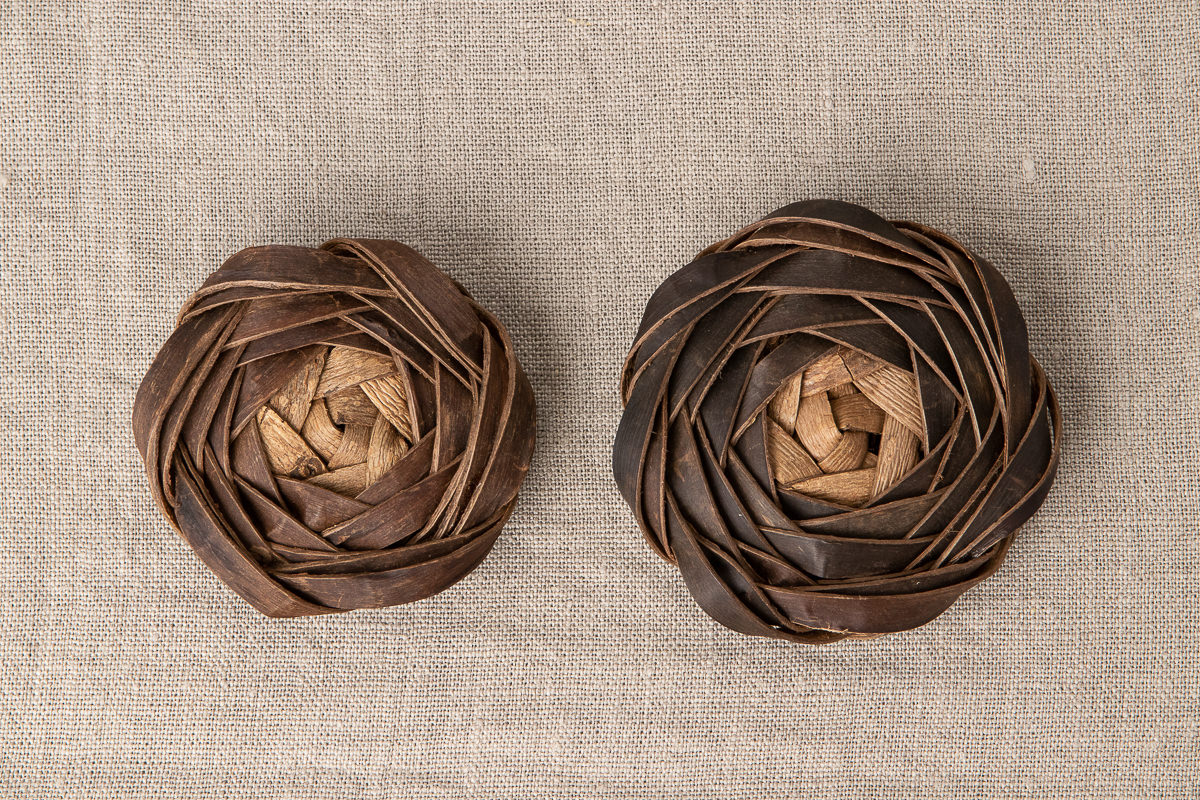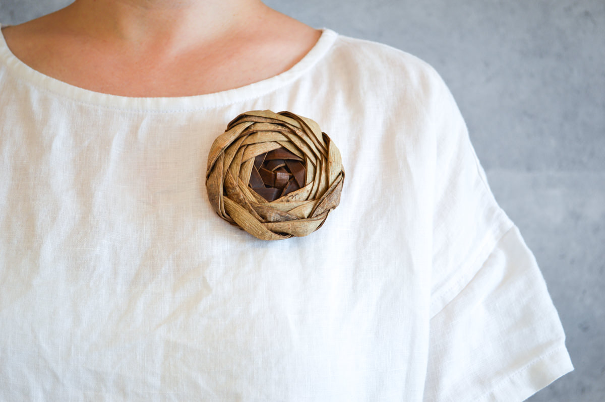 こちらはくるみの樹皮をバラのような形に編んだブローチです。