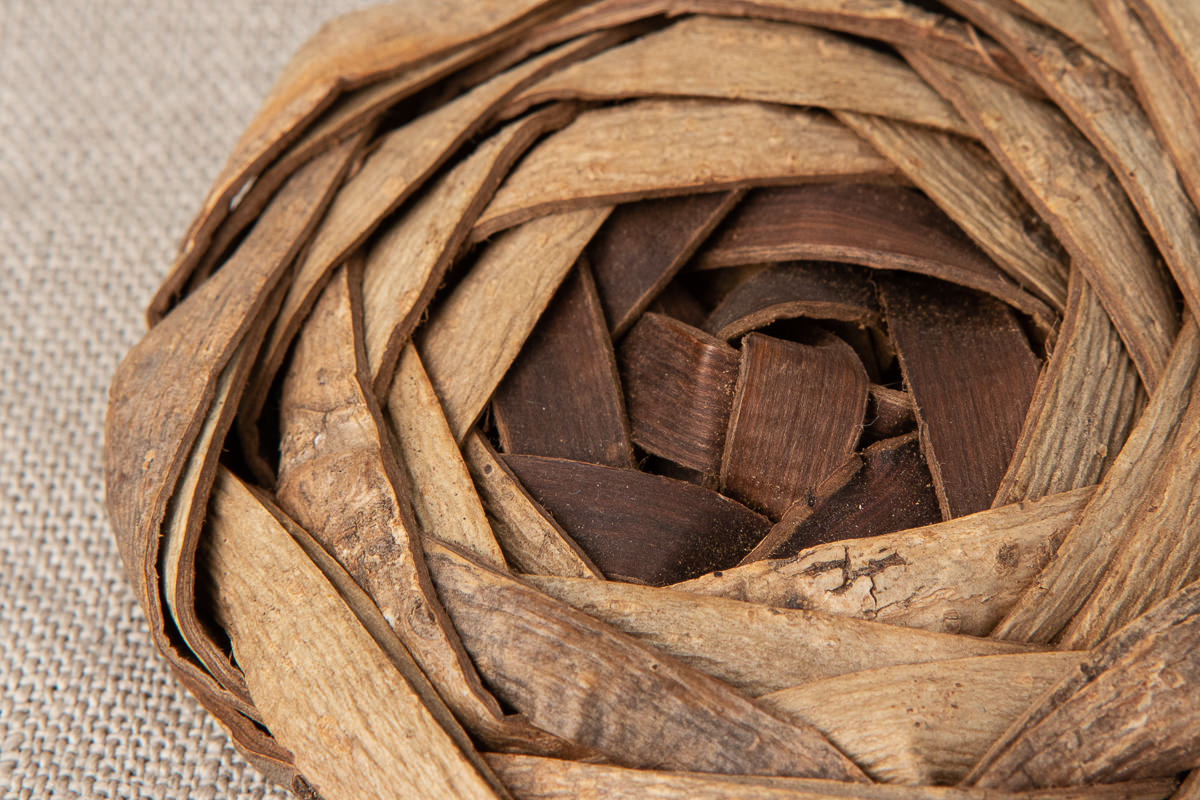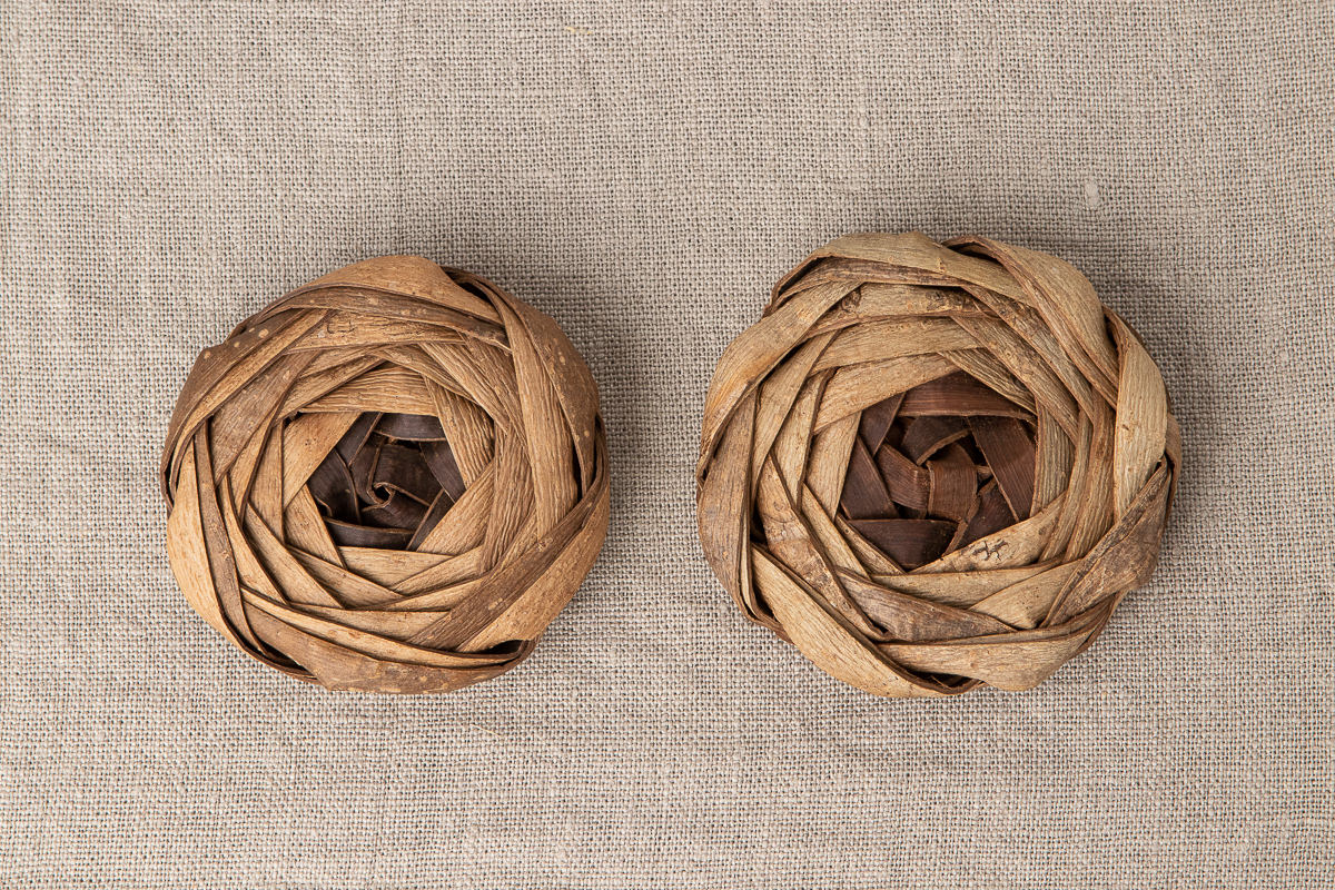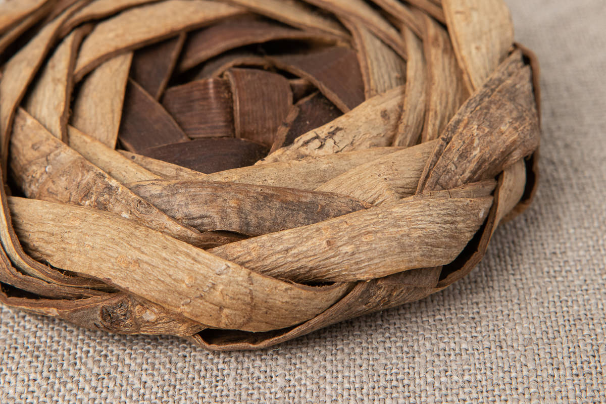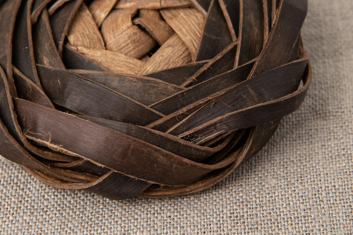 こちらはくるみの樹皮をバラのような形に編んだブローチです。