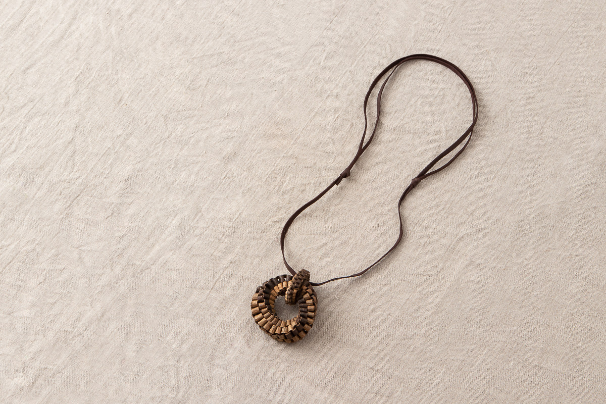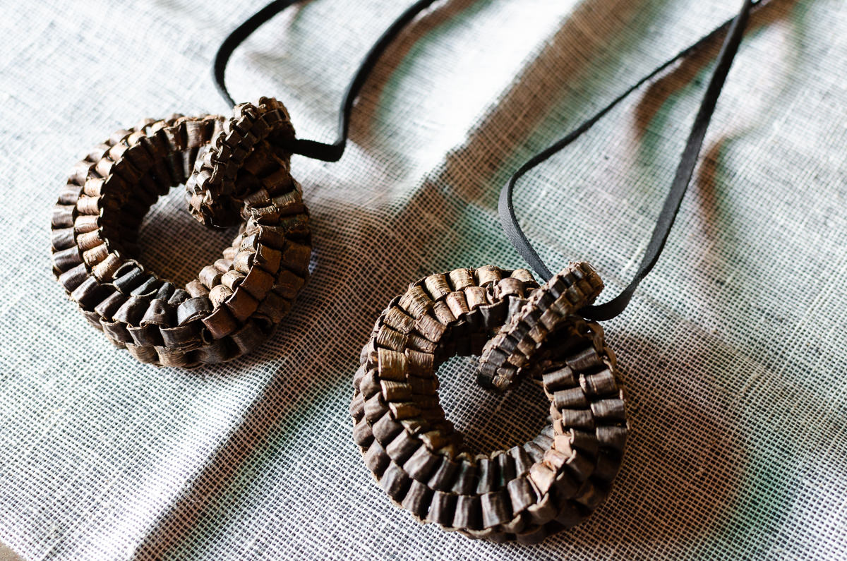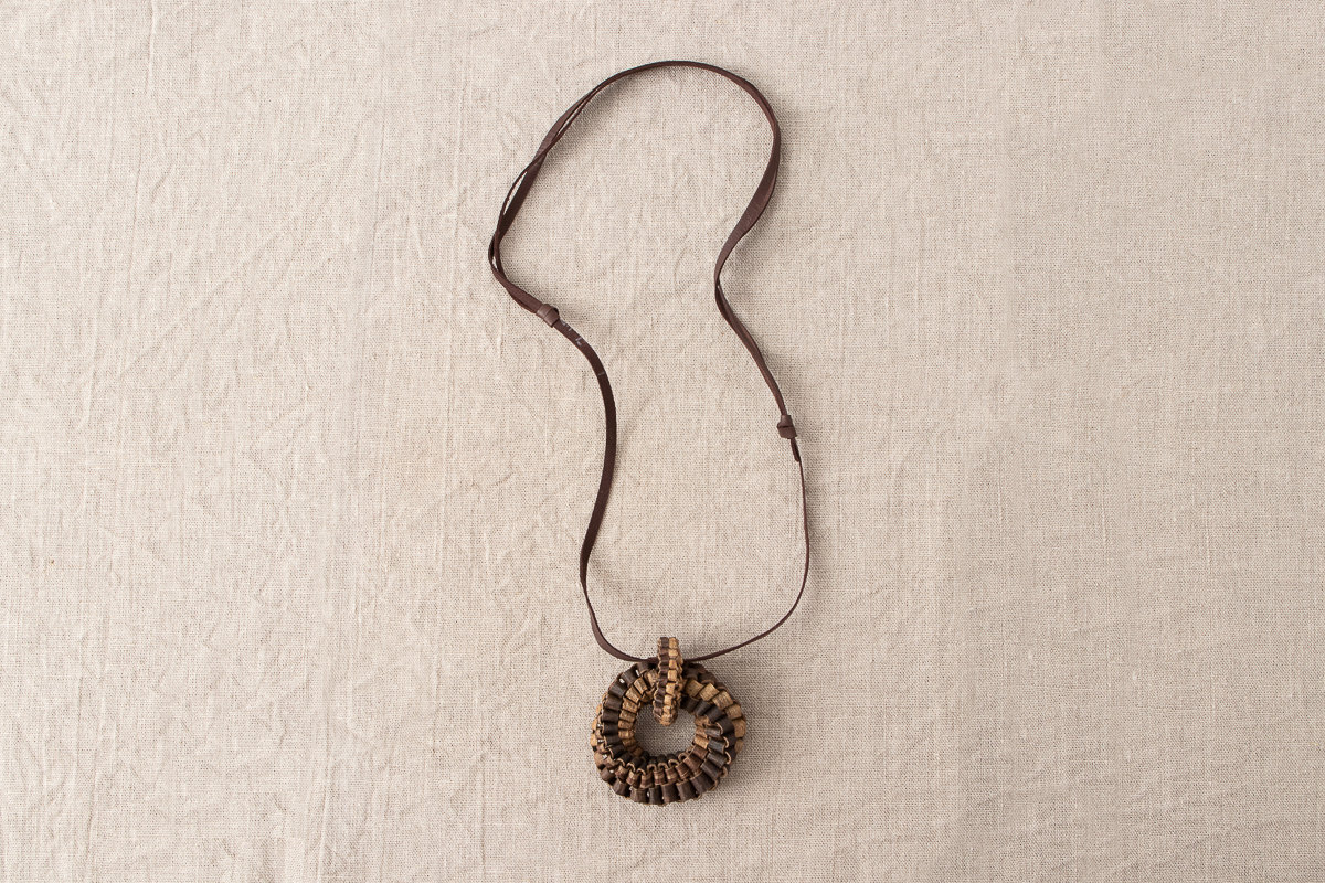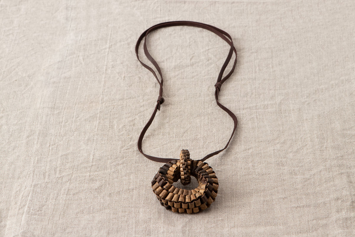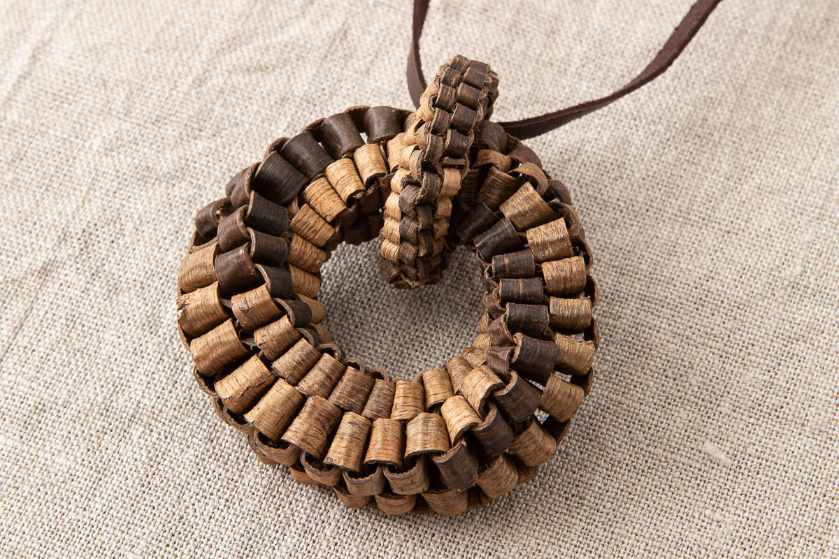 こちら、くるみの樹皮を使って編まれたヘッドのついたペンダントをご紹介します。